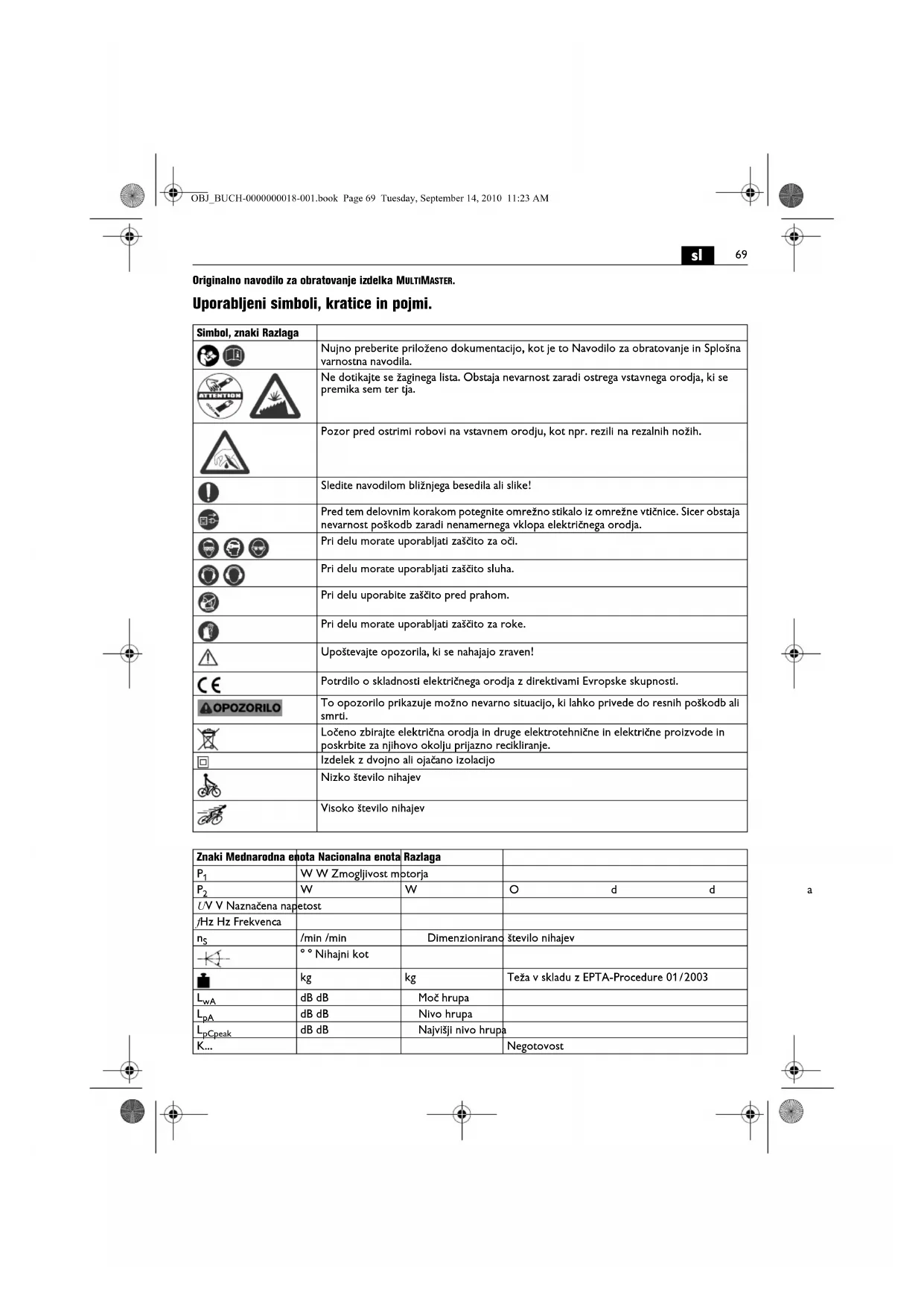 Originalno navodilo za obratovanje izdelka MULTIMASTER. Uporabljeni simboli, kratice in pojmi. Simbol, znaki Razlaga Nujno preberite priloženo dokumentacijo, kot je to Navodilo za obratovanje in Splošna varnostna navodila. Ne dotikajte se žaginega lista. Obstaja nevarnost zaradi ostrega vstavnega orodja, ki se premika sem ter tja. Pozor pred ostrimi robovi na vstavnem orodju, kot npr. rezili na rezalnih nožih. Sledite navodilom bližnjega besedila ali slike! Pred tem delovnim korakom potegnite omrežno stikalo iz omrežne vtičnice. Sicer obstaja nevarnost poškodb zaradi nenamernega vklopa električnega orodja. Pri delu morate uporabljati zaščito za oči. Pri delu morate uporabljati zaščito sluha. Pri delu uporabite zaščito pred prahom. Pri delu morate uporabljati zaščito za roke. Upoštevajte opozorila, ki se nahajajo zraven! Potrdilo o skladnosti električnega orodja z direktivami Evropske skupnosti. To opozorilo prikazuje možno nevarno situacijo, ki lahko privede do resnih poškodb ali smrti. Ločeno zbirajte električna orodja in druge elektrotehnične in električne proizvode in poskrbite za njihovo okolju prijazno recikliranje. Izdelek z dvojno ali ojačano izolacijo Nizko število nihajev Visoko število nihajev Znaki Mednarodna enota Nacionalna enota Razlaga