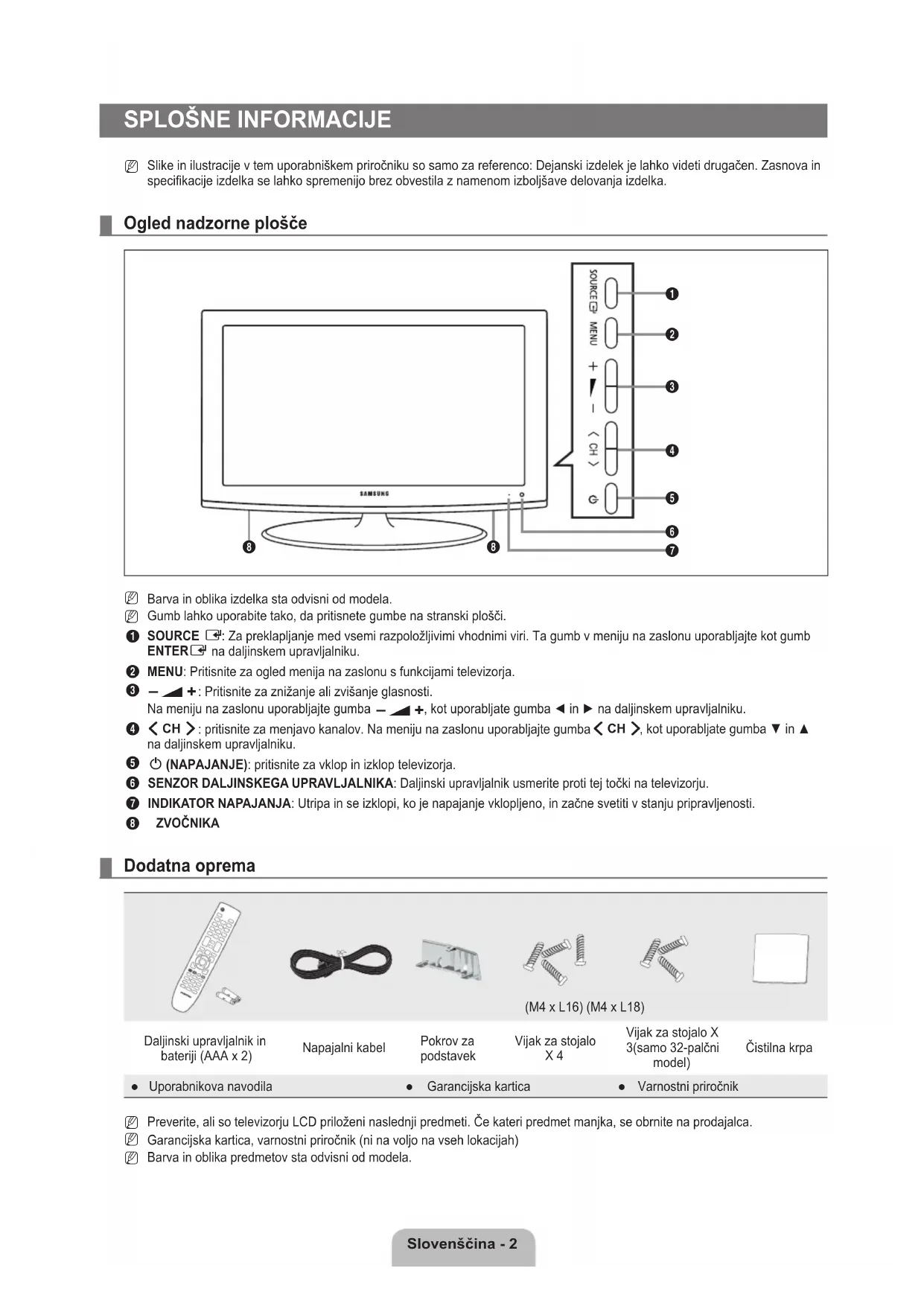 Slike in ilustracije v tem uporabniškem priročniku so samo za referenco: Dejanski izdelek je lahko videti drugačen. Zasnova in specikacije izdelka se lahko spremenijo brez obvestila z namenom izboljšave delovanja izdelka. Oglednadzorneplošče Barva in oblika izdelka sta odvisni od modela. Gumb lahko uporabite tako, da pritisnete gumbe na stranski plošči.