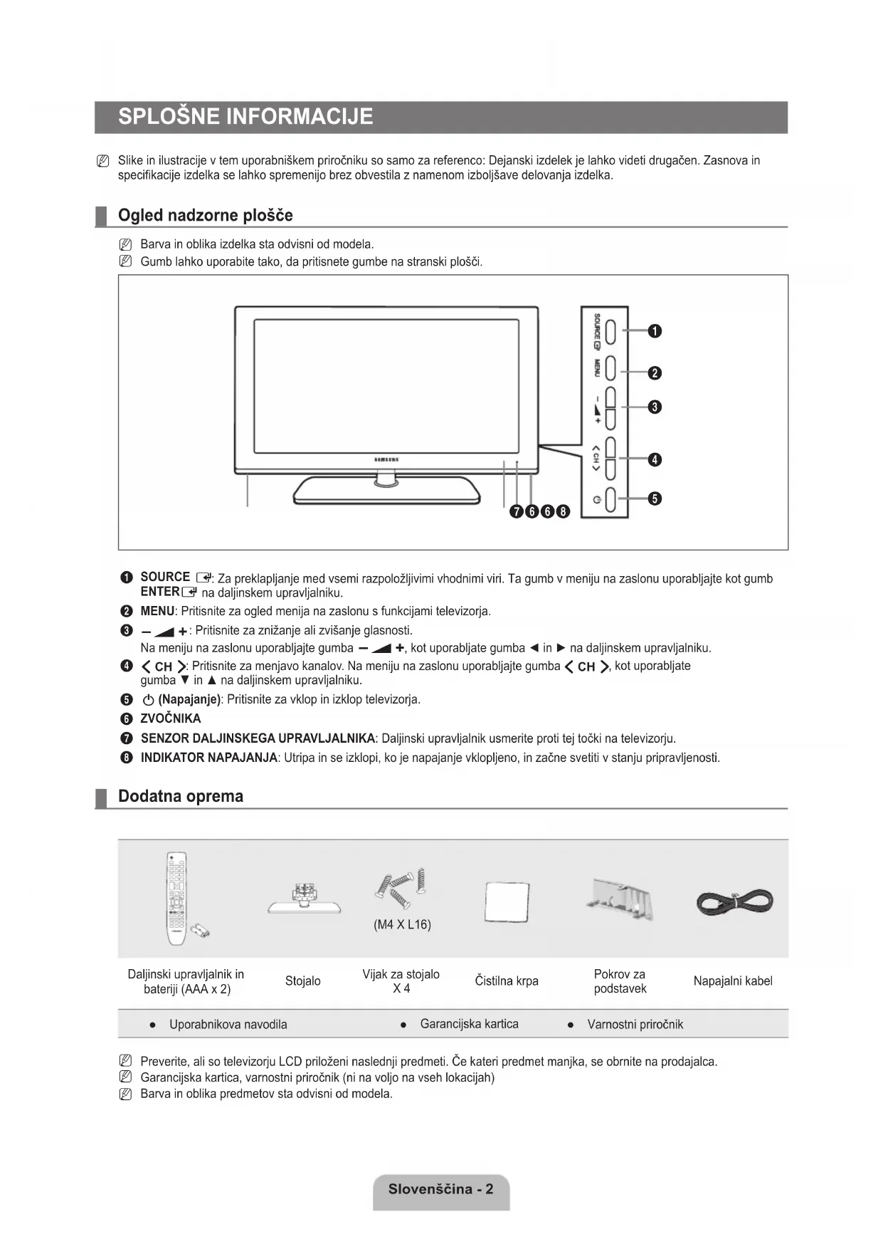SPLOŠNE INFORMACIJE Slike in ilustracije v tem uporabniškem priročniku so samo za referenco: Dejanski izdelek je lahko videti drugačen. Zasnova in specikacije izdelka se lahko spremenijo brez obvestila z namenom izboljšave delovanja izdelka. Ogled nadzorne plošče Barva in oblika izdelka sta odvisni od modela.Gumb lahko uporabite tako, da pritisnete gumbe na stranski plošči. 1 SOURCE E : Za preklapljanje med vsemi razpoložljivimi vhodnimi viri. Ta gumb v meniju na zaslonu uporabljajte kot gumb ENTER E na daljinskem upravljalniku. 2 MENU: Pritisnite za ogled menija na zaslonu s funkcijami televizorja. 3