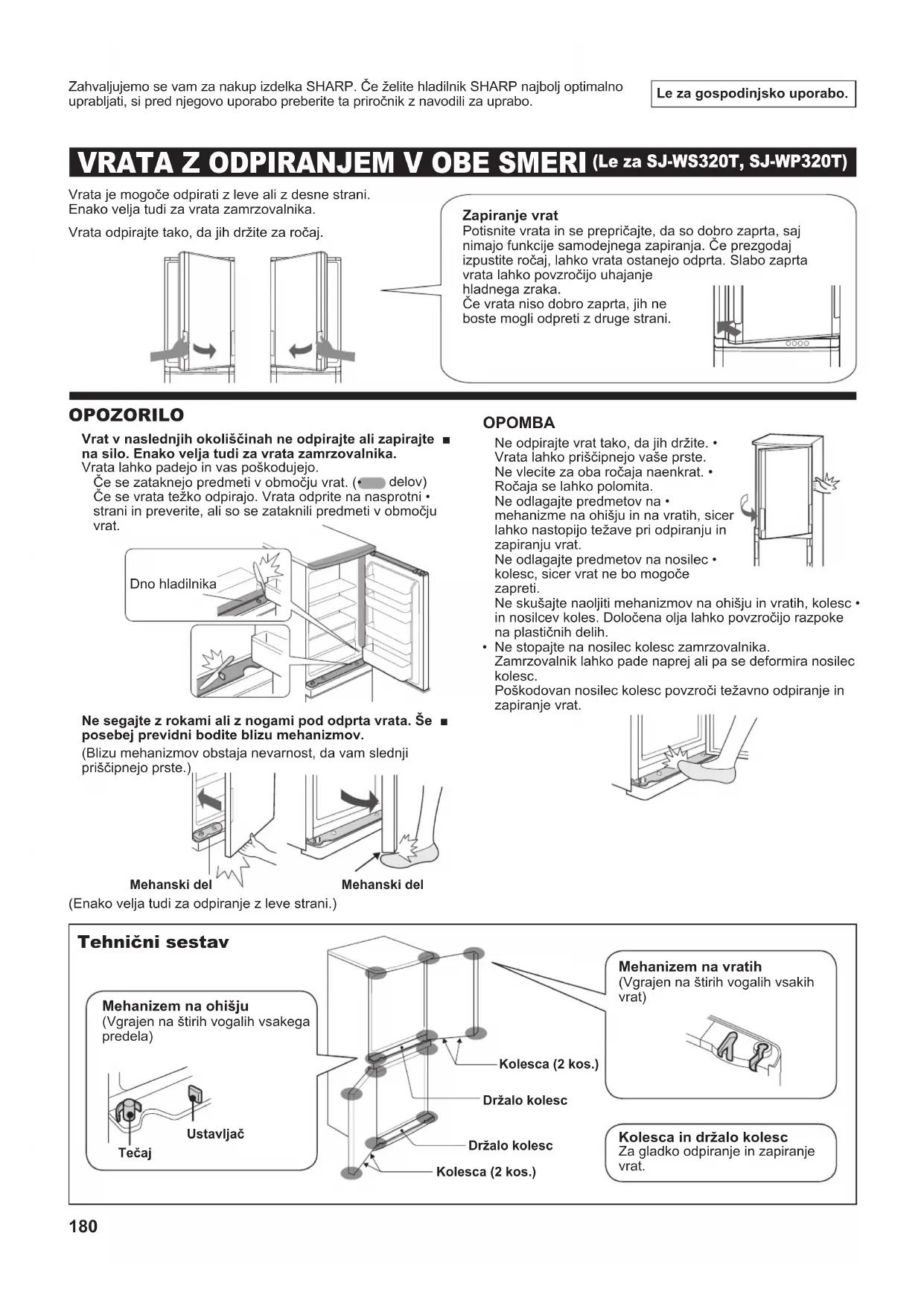 Pöörduge lähima SHARPi poolt volitatud remonditeenuse pakkuja poole. (B107)_BOOK-E.indb 179 2010/09/28 16:30:00180 Le za gospodinjsko uporabo. OPOZORILO Vrat v naslednjih okoliščinah ne odpirajte ali zapirajte ■na silo. Enako velja tudi za vrata zamrzovalnika.Vrata lahko padejo in vas poškodujejo.Če se zataknejo predmeti v območju vrat. (• delov)Če se vrata težko odpirajo. Vrata odprite na nasprotni • strani in preverite, ali so se zataknili predmeti v območju vrat.Ne segajte z rokami ali z nogami pod odprta vrata. Še ■posebej previdni bodite blizu mehanizmov.(Blizu mehanizmov obstaja nevarnost, da vam slednji priščipnejo prste.) OPOMBA Ne odpirajte vrat tako, da jih držite. • Vrata lahko priščipnejo vaše prste.Ne vlecite za oba ročaja naenkrat. • Ročaja se lahko polomita.Ne odlagajte predmetov na • mehanizme na ohišju in na vratih, sicer lahko nastopijo težave pri odpiranju in zapiranju vrat.Ne odlagajte predmetov na nosilec • kolesc, sicer vrat ne bo mogoče zapreti.Ne skušajte naoljiti mehanizmov na ohišju in vratih, kolesc • in nosilcev koles. Določena olja lahko povzročijo razpoke na plastičnih delih. Ne stopajte na nosilec kolesc zamrzovalnika. • Zamrzovalnik lahko pade naprej ali pa se deformira nosilec kolesc. Poškodovan nosilec kolesc povzroči težavno odpiranje in zapiranje vrat. Tehnični sestav