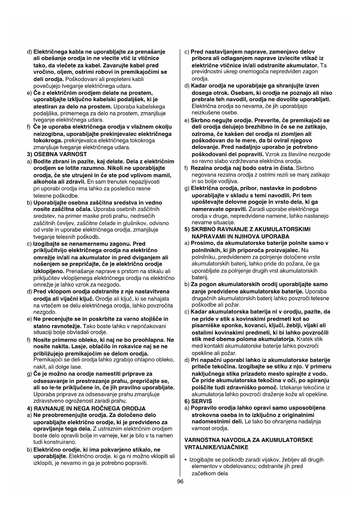 a) Prosimo, da akumulatorske baterije polnite samo v polnilnikih, ki jih priporoča proizvajalec. Na polnilniku, predvidenem za polnjenje določene vrste akumulatorskih baterij, lahko pride do požara, če ga uporabljate za polnjenje drugih vrst akumulatorskih baterij. b) Za pogon akumulatorskih orodij uporabljajte samo zanje predvidene akumulatorske baterije. Uporaba drugačnih akumulatorskih baterij lahko povzroči telesne poškodbe ali požar. c) Kadar akumulatorska baterija ni v orodju, pazite, da ne pride v stik s kovinskimi predmeti kot so pisarniške sponke, kovanci, ključi, žeblji, vijaki ali ostalimi kovinskimi predmeti, ki bi lahko povzročili stik med obema poloma akumulatorja. Kratek stik med kontakti akumulatorske baterije lahko povzroči opekline ali požar. d) Pri napačni uporabi lahko iz akumulatorske baterije priteče tekočina. Izogibajte se stiku z njo. V primeru naključnega stika prizadeto mesto spirajte z vodo. Če pride akumulatorska tekočina v oči, po spiranju poiščite tudi zdravniško pomoč. Iztekanje tekočine iz akumulatorja lahko povzroči draženje kože ali opekline.