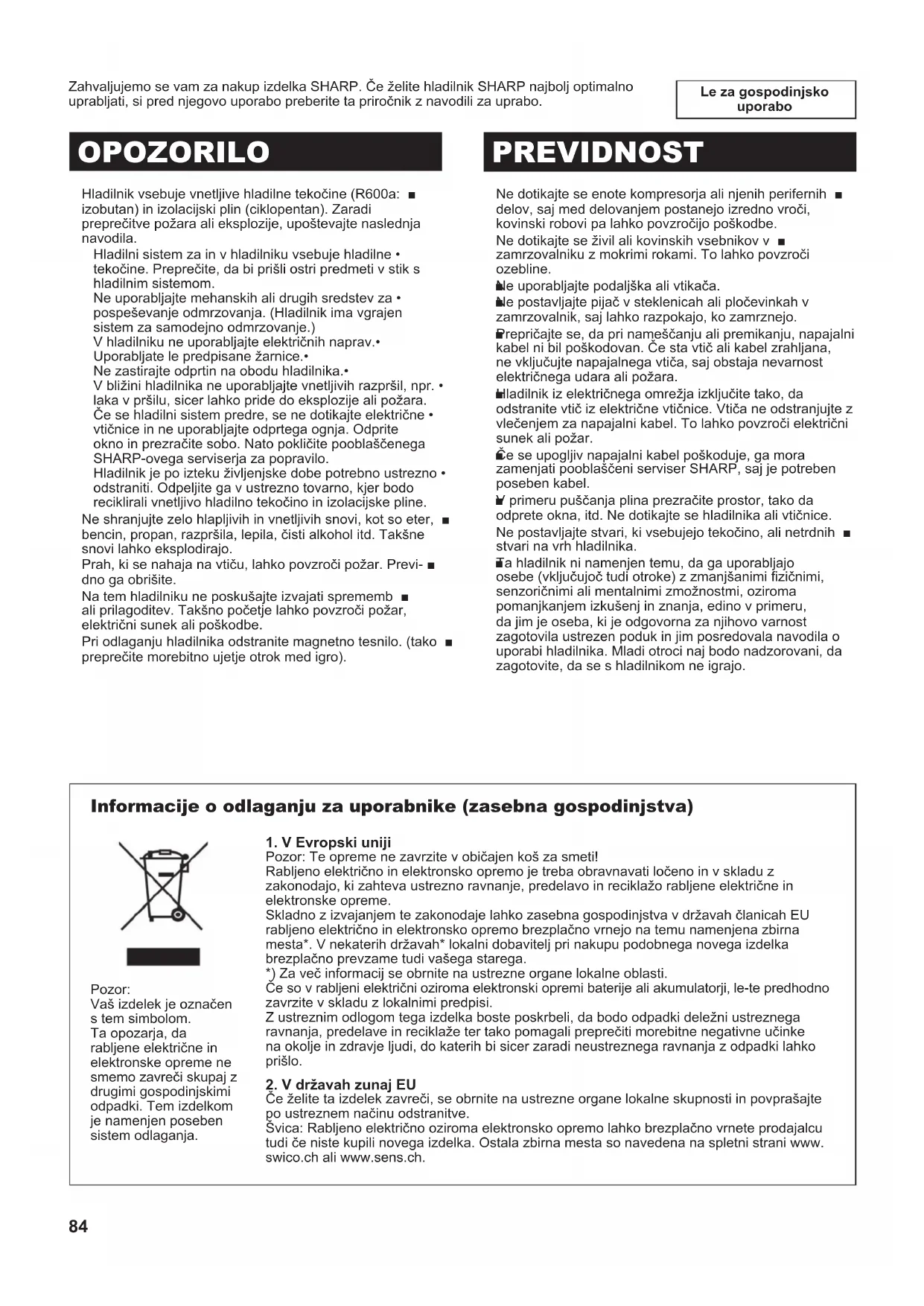 (B191)-East.indb 5 2011/03/14 17:00:2984 Le za gospodinjsko uporabo Zahvaljujemo se vam za nakup izdelka SHARP. Če želite hladilnik SHARP najbolj optimalno uprabljati, si pred njegovo uporabo preberite ta priročnik z navodili za uprabo. Hladilnik vsebuje vnetljive hladilne tekočine (R600a: ■ izobutan) in izolacijski plin (ciklopentan). Zaradi preprečitve požara ali eksplozije, upoštevajte naslednja navodila. Hladilni sistem za in v hladilniku vsebuje hladilne • tekočine. Preprečite, da bi prišli ostri predmeti v stik s hladilnim sistemom. Ne uporabljajte mehanskih ali drugih sredstev za • pospeševanje odmrzovanja. (Hladilnik ima vgrajen sistem za samodejno odmrzovanje.) V hladilniku ne uporabljajte električnih naprav.• Uporabljate le predpisane žarnice.• Ne zastirajte odprtin na obodu hladilnika.• V bližini hladilnika ne uporabljajte vnetljivih razpršil, npr. • laka v pršilu, sicer lahko pride do eksplozije ali požara. Če se hladilni sistem predre, se ne dotikajte električne • vtičnice in ne uporabljajte odprtega ognja. Odprite okno in prezračite sobo. Nato pokličite pooblaščenega SHARP-ovega serviserja za popravilo. Hladilnik je po izteku življenjske dobe potrebno ustrezno • odstraniti. Odpeljite ga v ustrezno tovarno, kjer bodo reciklirali vnetljivo hladilno tekočino in izolacijske pline. Ne shranjujte zelo hlapljivih in vnetljivih snovi, kot so eter, ■ bencin, propan, razpršila, lepila, čisti alkohol itd. Takšne snovi lahko eksplodirajo. Prah, ki se nahaja na vtiču, lahko povzroči požar. Previ- ■ dno ga obrišite. Na tem hladilniku ne poskušajte izvajati sprememb ■ ali prilagoditev. Takšno početje lahko povzroči požar, električni sunek ali poškodbe. Pri odlaganju hladilnika odstranite magnetno tesnilo. (tako ■ preprečite morebitno ujetje otrok med igro). OPOZORILO PREVIDNOST Ne dotikajte se enote kompresorja ali njenih perifernih ■ delov, saj med delovanjem postanejo izredno vroči, kovinski robovi pa lahko povzročijo poškodbe. Ne dotikajte se živil ali kovinskih vsebnikov v ■ zamrzovalniku z mokrimi rokami. To lahko povzroči ozebline. Ne uporabljajte podaljška ali vtikača. ■ Ne postavljajte pijač v steklenicah ali pločevinkah v ■ zamrzovalnik, saj lahko razpokajo, ko zamrznejo. Prepričajte se, da pri nameščanju ali premikanju, napajalni ■ kabel ni bil poškodovan. Če sta vtič ali kabel zrahljana, ne vključujte napajalnega vtiča, saj obstaja nevarnost električnega udara ali požara. Hladilnik iz električnega omrežja izključite tako, da ■ odstranite vtič iz električne vtičnice. Vtiča ne odstranjujte z vlečenjem za napajalni kabel. To lahko povzroči električni sunek ali požar. Če se upogljiv napajalni kabel poškoduje, ga mora ■ zamenjati pooblaščeni serviser SHARP, saj je potreben poseben kabel. V primeru puščanja plina prezračite prostor, tako da ■ odprete okna, itd. Ne dotikajte se hladilnika ali vtičnice. Ne postavljajte stvari, ki vsebujejo tekočino, ali netrdnih ■ stvari na vrh hladilnika. Ta hladilnik ni namenjen temu, da ga uporabljajo ■ osebe (vključujoč tudi otroke) z zmanjšanimi zičnimi, senzoričnimi ali mentalnimi zmožnostmi, oziroma pomanjkanjem izkušenj in znanja, edino v primeru, da jim je oseba, ki je odgovorna za njihovo varnost zagotovila ustrezen poduk in jim posredovala navodila o uporabi hladilnika. Mladi otroci naj bodo nadzorovani, da zagotovite, da se s hladilnikom ne igrajo. Informacije o odlaganju za uporabnike (zasebna gospodinjstva)