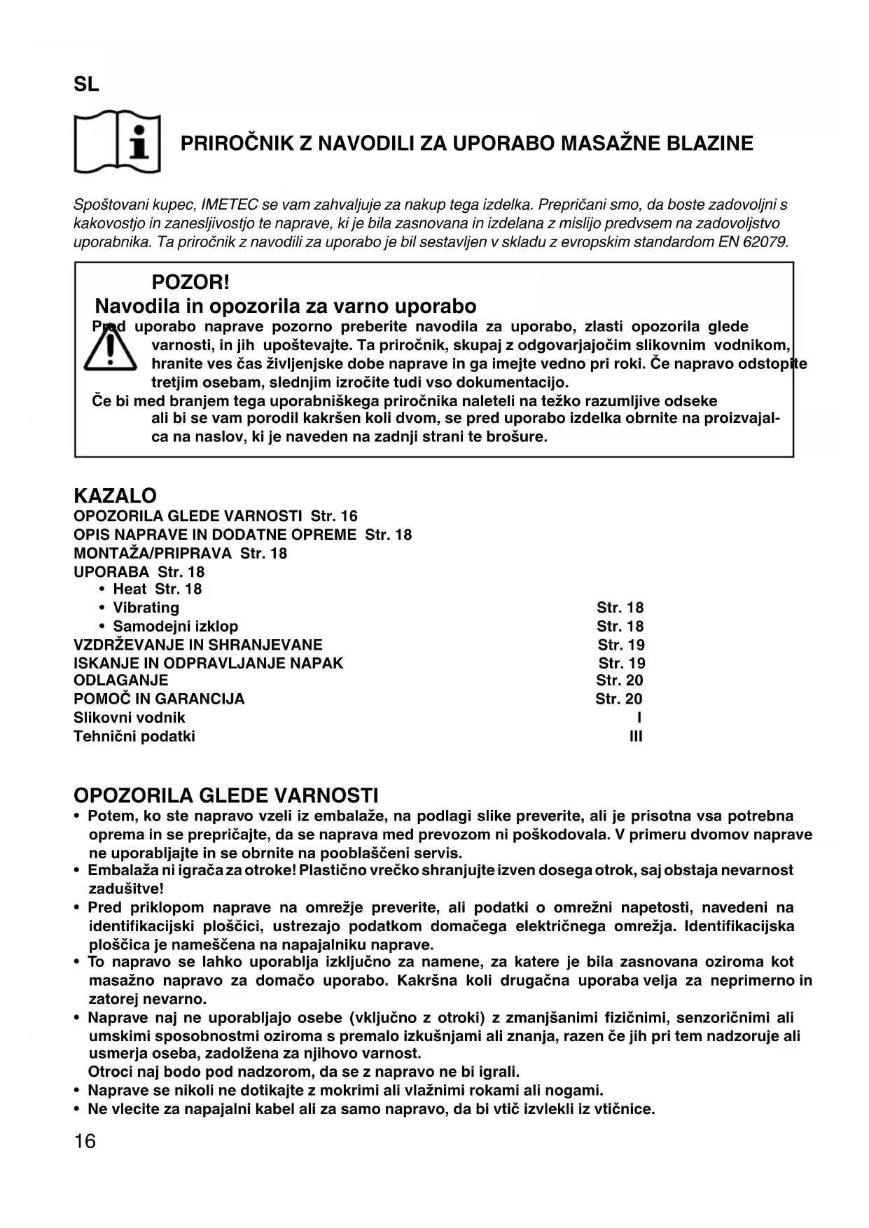 PRIROČNIK Z NAVODILI ZA UPORABO MASAŽNE BLAZINE Spoštovani kupec, IMETEC se vam zahvaljuje za nakup tega izdelka. Prepričani smo, da boste zadovoljni s