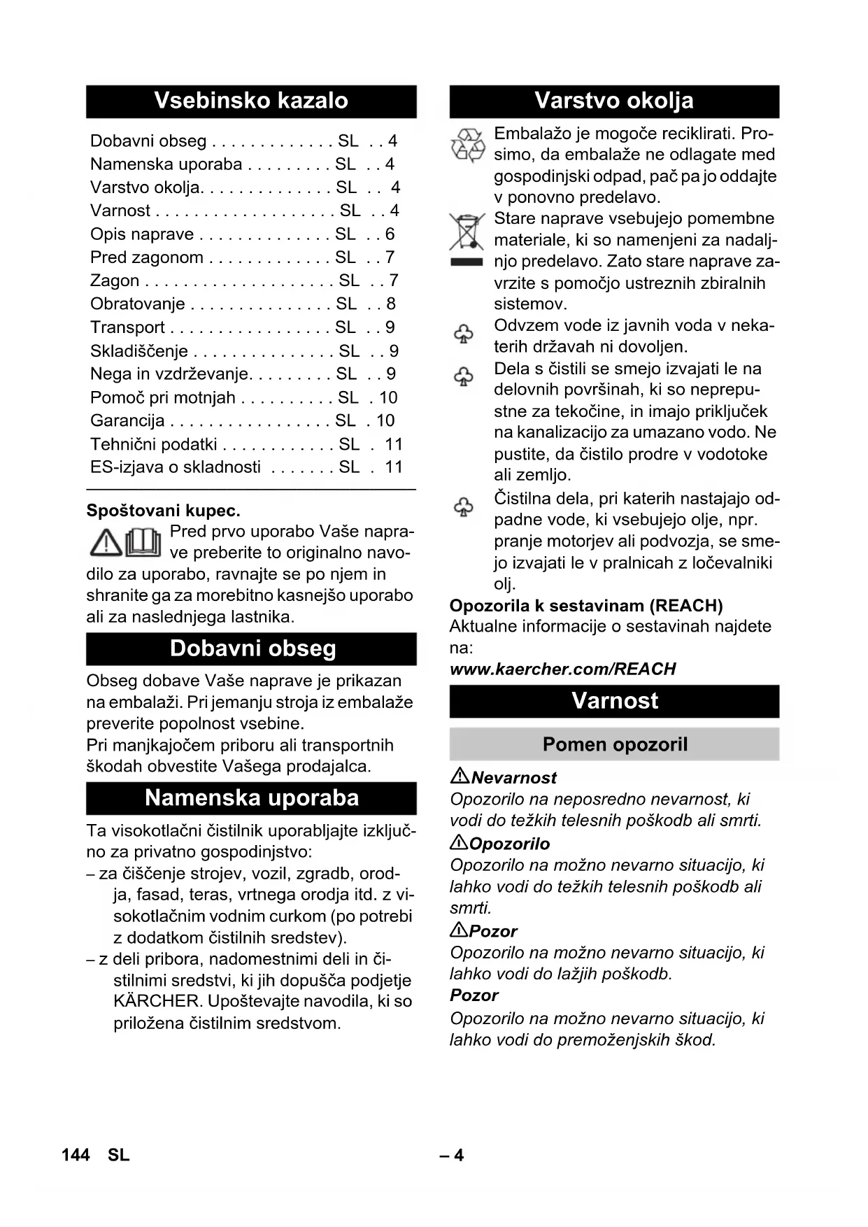 Spoštovani kupec. Pred prvo uporabo Vaše napra- ve preberite to originalno navo- dilo za uporabo, ravnajte se po njem in shranite ga za morebitno kasnejšo uporabo ali za naslednjega lastnika. Obseg dobave Vaše naprave je prikazan na embalaži. Pri jemanju stroja iz embalaže preverite popolnost vsebine. Pri manjkajočem priboru ali transportnih škodah obvestite Vašega prodajalca. Ta visokotlačni čistilnik uporabljajte izključ- no za privatno gospodinjstvo: – za čiščenje strojev, vozil, zgradb, orod- ja, fasad, teras, vrtnega orodja itd. z vi- sokotlačnim vodnim curkom (po potrebi z dodatkom čistilnih sredstev). – z deli pribora, nadomestnimi deli in či- stilnimi sredstvi, ki jih dopušča podjetje KÄRCHER. Upoštevajte navodila, ki so priložena čistilnim sredstvom. Embalažo je mogoče reciklirati. Pro- simo, da embalaže ne odlagate med gospodinjski odpad, pač pa jo oddajte v ponovno predelavo. Stare naprave vsebujejo pomembne materiale, ki so namenjeni za nadalj- njo predelavo. Zato stare naprave za- vrzite s pomočjo ustreznih zbiralnih sistemov. Odvzem vode iz javnih voda v neka- terih državah ni dovoljen. Dela s čistili se smejo izvajati le na delovnih površinah, ki so neprepu- stne za tekočine, in imajo priključek na kanalizacijo za umazano vodo. Ne pustite, da čistilo prodre v vodotoke ali zemljo. Čistilna dela, pri katerih nastajajo od- padne vode, ki vsebujejo olje, npr. pranje motorjev ali podvozja, se sme- jo izvajati le v pralnicah z ločevalniki olj. Opozorila k sestavinam (REACH) Aktualne informacije o sestavinah najdete na: www.kaercher.com/REACH Nevarnost Opozorilo na neposredno nevarnost, ki vodi do težkih telesnih poškodb ali smrti. 몇 Opozorilo Opozorilo na možno nevarno situacijo, ki lahko vodi do težkih telesnih poškodb ali smrti. 몇 Pozor Opozorilo na možno nevarno situacijo, ki lahko vodi do lažjih poškodb. Pozor Opozorilo na možno nevarno situacijo, ki lahko vodi do premoženjskih škod. Vsebinsko kazalo Dobavni obseg . . . . . . . . . . . . . SL . . 4 Namenska uporaba . . . . . . . . . SL . . 4 Varstvo okolja. . . . . . . . . . . . . . SL . . 4 Varnost . . . . . . . . . . . . . . . . . . . SL . . 4 Opis naprave . . . . . . . . . . . . . . SL . . 6 Pred zagonom . . . . . . . . . . . . . SL . . 7 Zagon . . . . . . . . . . . . . . . . . . . . SL . . 7 Obratovanje . . . . . . . . . . . . . . . SL . . 8 Transport . . . . . . . . . . . . . . . . . SL . . 9 Skladiščenje . . . . . . . . . . . . . . . SL . . 9 Nega in vzdrževanje. . . . . . . . . SL . . 9 Pomoč pri motnjah . . . . . . . . . . SL . 10 Garancija . . . . . . . . . . . . . . . . . SL . 10 Tehnični podatki . . . . . . . . . . . . SL . 11 ES-izjava o skladnosti . . . . . . . SL . 11 Dobavni obseg Namenska uporaba Varstvo okolja Varnost Pomen opozoril 144 SL– 5 Visokotlačnega curka ne usmerjajte v osebe, živali, ak- tivno električno opremo ali na samo napravo. Napravo zaščitite pred zmrzaljo. Naprave se ne sme priključiti ne- posredno na javno omrežje pitne vode. Nevarnost Električnega vtiča in vtičnice nikoli ne prijemajte z vlažnimi rokami. Pred vsako uporabo preverite električni priključni kabel z električnim vtičem gle- de poškodb. Poškodovani električni pri- ključni kabel mora pooblaščena servi- sna služba / električar nemudoma za- menjati. Ne uporabljajte naprave s po- škodovanim električnim priključnim ka- blom. Vsi deli v delovnem območju, ki so pod napetostjo, morajo biti zaščiteni pred vodnim curkom. Električni vtiči in spojke podaljševalne- ga kabla morajo biti vodotesni in ne smejo ležati v vodi. Spojka nadalje ne sme ležati na tleh. Priporoča se, da uporabljate bobne za kable, ki zagota- vljajo, da se vtičnice nahajajo najmanj 60 mm nad tlemi. Pazite na to, da električnega priključne- ga kabla ali podaljševalnega kabla ne poškodujete s prevoženjem, stisnje- njem, vlečenjem ali podobnim. Električ- ne kable zaščitite pred vročino, oljem in ostrimi robovi. 몇 Opozorilo Napravo priključite le na izmenični tok. Napetost se mora ujemati s tipsko plo- ščico naprave. Napravo se sme priključiti le na električ- ni priključek, ki ga je elektro inštalater izvedel v skladu z IEC 60364. Neustrezni električni podaljševalni kabli so lahko nevarni. Na prostem upora- bljajte le atestirane in ustrezno označe- ne električne podaljševalne kable z za- dostnim presekom kabla: