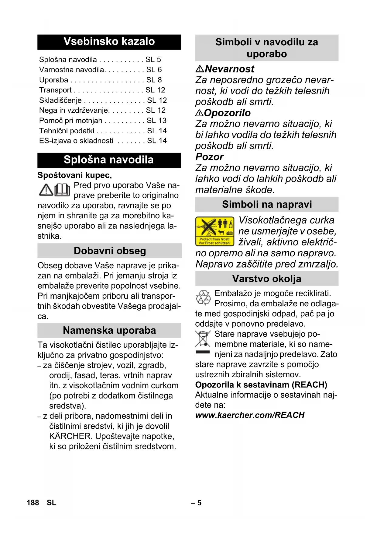 Podaljševalni kabel vedno do konca odvijte z bobna za na- vijanje kabla. Visokotlačne gibke cevi, ar- mature in vezave so po- membne za varnost stroja. Uporabljajte le visokotlačne gibke cevi, armature in veza- ve, ki jih je priporočil proizva- jalec. S strojem ne smejo delati otroci, mladoletne ali neuspo- sobljene osebe. Ta naprava ni namenjena uporabi oseb z omejenimi fi- zičnimi, senzoričnimi ali du- ševnimi sposobnostmi ali po- manjkljivimi izkušnjami in/ali pomanjkljivim znanjem, razen če jih nadzoruje oseba, pri- stojna za njihovo varnost, ali so od nje prejeli navodila, kako napravo uporabljati, ter so razumeli nevarnosti, ki iz tega izhajajo. Otroci se z napravo ne smejo igrati. Nadzorujte otroke, da zagoto- vite, da se z napravo ne igrajo. Embalažne folije hranite proč od otrok, obstaja nevarnost zadušitve! Uporabnik mora stroj upora- bljati v skladu z njegovim na- menom. Mora upoštevati lo- kalne danosti in pri delu s strojem paziti na osebe v oko- lici. Naprave ne uporabljajte, če se v njenem dosegu nahajajo druge osebe, razen, če sle- dnje nosijo zaščitna oblačila. Za zaščito pred brizganjem vode ali umazanije nosite pri- merno zaščitno obleko in za- ščitne očale. Ta stroj je razvit za uporabo čistilnih sredstev, ki jih je do- stavil ali priporočil proizvaja- lec. Uporaba drugih čistilnih sredstev ali kemikalij lahko ovira varnost stroja. Pozor Pri daljših prekinitvah obrato- vanja izklopite napravo na glavnem stikalu/stikalu na- prave ali izvlecite omrežni vtič. Naprave ne uporabljajte pri temperaturah pod 0 °C. Pri čiščenju lakiranih površin ohranjujte oddaljenost curka od najmanj 30 cm, da se izo- gnete poškodbam. 190 SL– 8