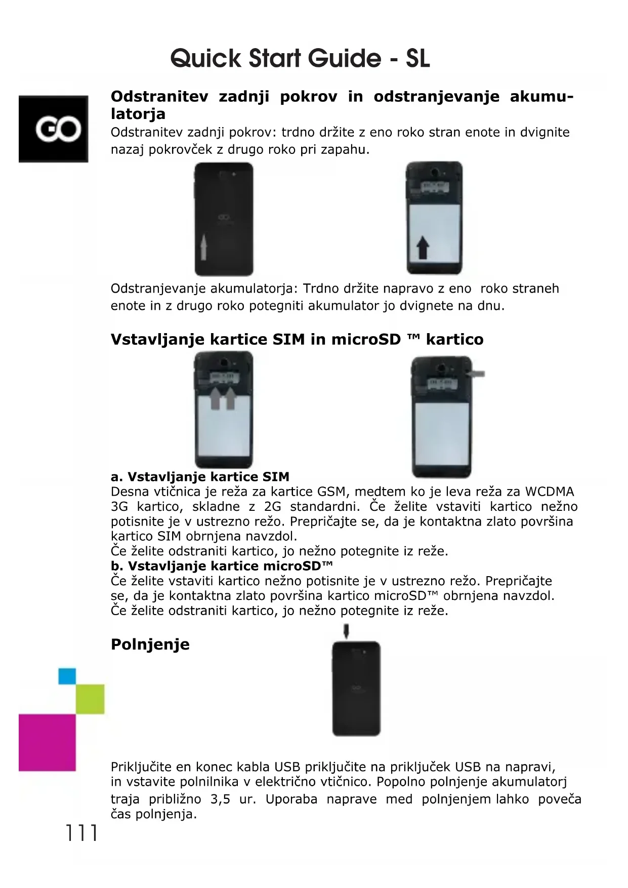 Quick Start Guide - SL 110Odstranitev zadnji pokrov in odstranjevanje akumu- latorja Odstranitev zadnji pokrov: trdno držite z eno roko stran enote in dvignite nazaj pokrovček z drugo roko pri zapahu. Odstranjevanje akumulatorja: Trdno držite napravo z eno roko straneh enote in z drugo roko potegniti akumulator jo dvignete na dnu. Vstavljanje kartice SIM in microSD ™ kartico a. Vstavljanje kartice SIM Desna vtičnica je reža za kartice GSM, medtem ko je leva reža za WCDMA 3G kartico, skladne z 2G standardni. Če želite vstaviti kartico nežno potisnite je v ustrezno režo. Prepričajte se, da je kontaktna zlato površina kartico SIM obrnjena navzdol. Če želite odstraniti kartico, jo nežno potegnite iz reže. b. Vstavljanje kartice microSD™ Če želite vstaviti kartico nežno potisnite je v ustrezno režo. Prepričajte se, da je kontaktna zlato površina kartico microSD™ obrnjena navzdol. Če želite odstraniti kartico, jo nežno potegnite iz reže. Polnjenje Priključite en konec kabla USB priključite na priključek USB na napravi, in vstavite polnilnika v električno vtičnico. Popolno polnjenje akumulatorj traja približno 3,5 ur. Uporaba naprave med polnjenjem lahko poveča čas polnjenja. Quick Start Guide - SL 111Quick Start Guide - SL Napomena: Če se telefon ne uporablja za dolgo časa, akumulator je postopoma razrešnico. Napolniti akumulatorj pred prvo uporabo, ali tudi če telefon ni v uporabi, napolnite baterijo vsake tri mesece. Vklop / izklop naprave/ stanje pripravljenosti Pritisnite in držite gumb za napajanje nekaj sekund. Se pojavi pozdravni zaslon, kasneje glavni zaslon. Ko tipko pritisnete enkrat, naprava preklopi v način mirovanja. Če želite izhod iz tega načina, znova pritisnite gumb za napajanje. Za izklop naprave, pritisnite in držite gumb za vklop, nakar izberite iz menija Power o (izklop). POTRDILO O SKLADNOSTI - DRŽAVE EU Tem sklepom GOCLEVER Sp. z o.o. izjavlja, da naprava QUANTUM 450 je skladen z bistvenimi zahtevami in drugimi ustreznimi določbami v skladu s temi direktivami: