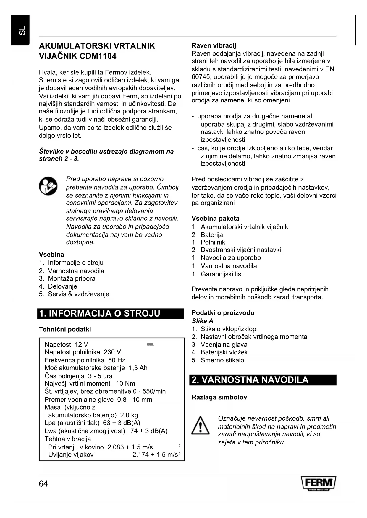 Hvala, ker ste kupili ta Fermov izdelek. S tem ste si zagotovili odličen izdelek, ki vam ga je dobavil eden vodilnih evropskih dobaviteljev. Vsi izdelki, ki vam jih dobavi Ferm, so izdelani po najvišjih standardih varnosti in učinkovitosti. Del naše lozoje je tudi odlična podpora strankam, ki se odraža tudi v naši obsežni garanciji. Upamo, da vam bo ta izdelek odlično služil še dolgo vrsto let. Številke v besedilu ustrezajo diagramom na straneh 2 - 3. Pred uporabo naprave si pozorno preberite navodila za uporabo. Čimbolj se seznanite z njenimi funkcijami in osnovnimi operacijami. Za zagotovitev stalnega pravilnega delovanja servisirajte napravo skladno z navodili. Navodila za uporabo in pripadajoča dokumentacija naj vam bo vedno dostopna. Vsebina