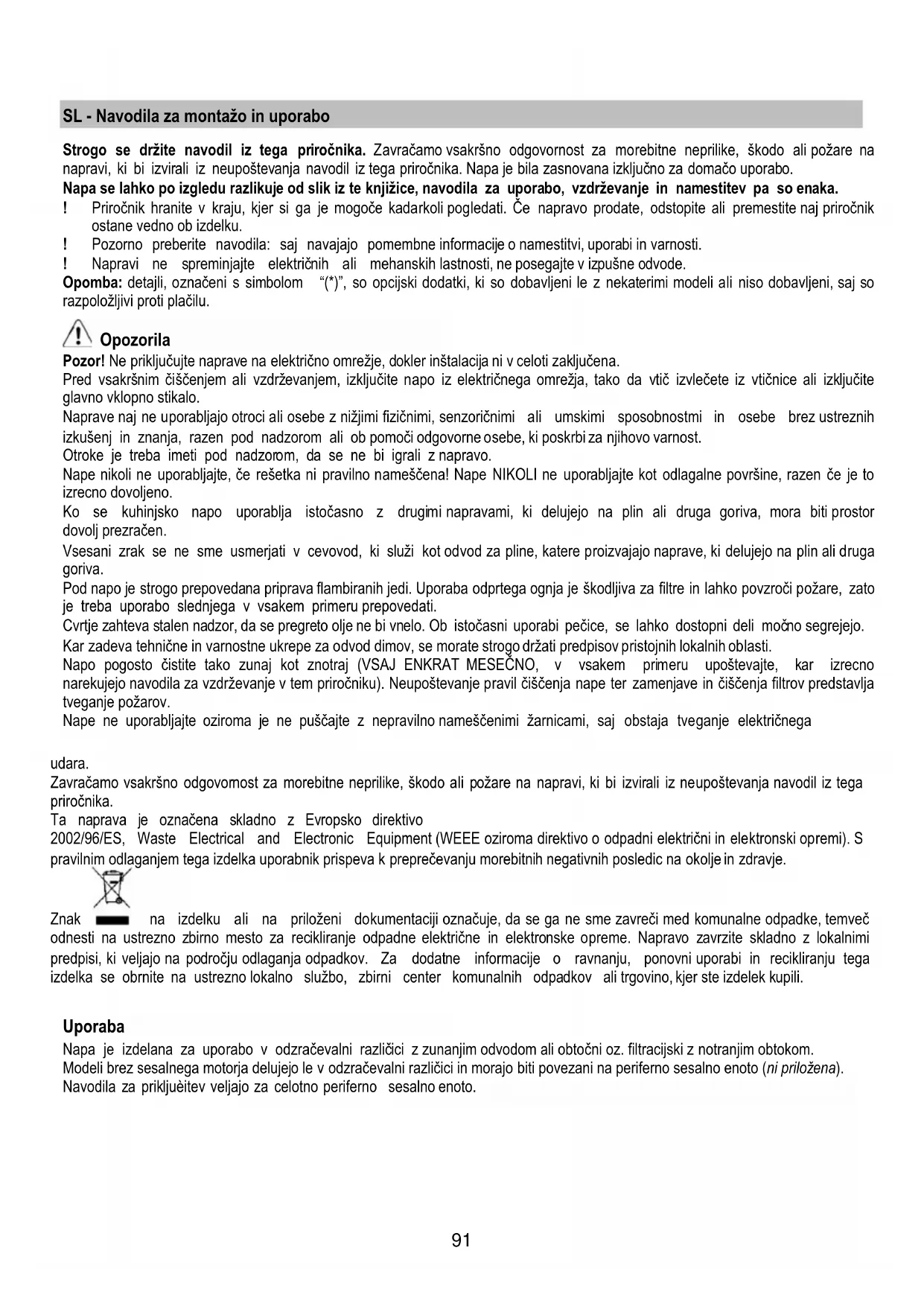napravi, ki bi izvirali iz neupoštevanja navodil iz tega priročnika. Napa je bila zasnovana izključno za domačo uporabo.