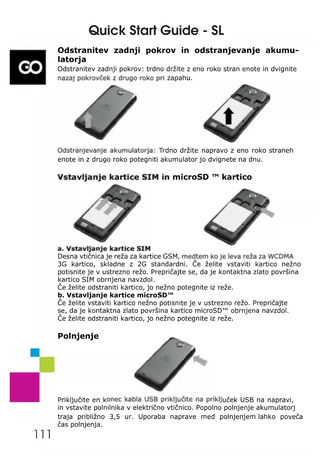 Quick Start Guide - SL 110Odstranitev zadnji pokrov in odstranjevanje akumu- latorja Odstranitev zadnji pokrov: trdno držite z eno roko stran enote in dvignite nazaj pokrovček z drugo roko pri zapahu. Odstranjevanje akumulatorja: Trdno držite napravo z eno roko straneh enote in z drugo roko potegniti akumulator jo dvignete na dnu. Vstavljanje kartice SIM in microSD ™ kartico a. Vstavljanje kartice SIM Desna vtičnica je reža za kartice GSM, medtem ko je leva reža za WCDMA 3G kartico, skladne z 2G standardni. Če želite vstaviti kartico nežno potisnite je v ustrezno režo. Prepričajte se, da je kontaktna zlato površina kartico SIM obrnjena navzdol. Če želite odstraniti kartico, jo nežno potegnite iz reže. b. Vstavljanje kartice microSD™ Če želite vstaviti kartico nežno potisnite je v ustrezno režo. Prepričajte se, da je kontaktna zlato površina kartico microSD™ obrnjena navzdol. Če želite odstraniti kartico, jo nežno potegnite iz reže. Polnjenje Priključite en konec kabla USB priključite na priključek USB na napravi, in vstavite polnilnika v električno vtičnico. Popolno polnjenje akumulatorj traja približno 3,5 ur. Uporaba naprave med polnjenjem lahko poveča čas polnjenja. Quick Start Guide - SL 111Quick Start Guide - SL Napomena: Če se telefon ne uporablja za dolgo časa, akumulator je postopoma razrešnico. Napolniti akumulatorj pred prvo uporabo, ali tudi če telefon ni v uporabi, napolnite baterijo vsake tri mesece. Vklop / izklop naprave/ stanje pripravljenosti Pritisnite in držite gumb za napajanje nekaj sekund. Se pojavi pozdravni zaslon, kasneje glavni zaslon. Ko tipko pritisnete enkrat, naprava preklopi v način mirovanja. Če želite izhod iz tega načina, znova pritisnite gumb za napajanje. Za izklop naprave, pritisnite in držite gumb za vklop, nakar izberite iz menija Power o (izklop). POTRDILO O SKLADNOSTI - DRŽAVE EU Tem sklepom GOCLEVER Sp. z o.o. izjavlja, da naprava QUANTUM 350 je skladen z bistvenimi zahtevami in drugimi ustreznimi določbami v skladu s temi direktivami: