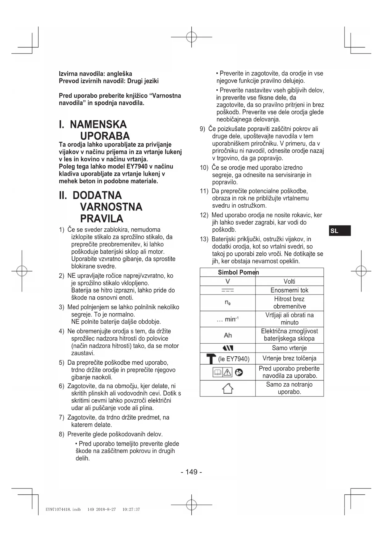VII. DODATEK NAJVEČJE PRIPOROČENE ZMOGLJIVOSTI Model EY7441 EY7940 EY7443 EY7451Izvijanje/Privijanje vijakovStrojni vijak M5Leseni vijak ø6,8 mm VrtanjeSamorezni vijak ø6 mm Za les ø35 mm Za kovino ø13 mm Za zidarstvo – ø13 mm – – EY971074418.indb 156 2018-8-27 10:27:38EY74A1 –- 157 -