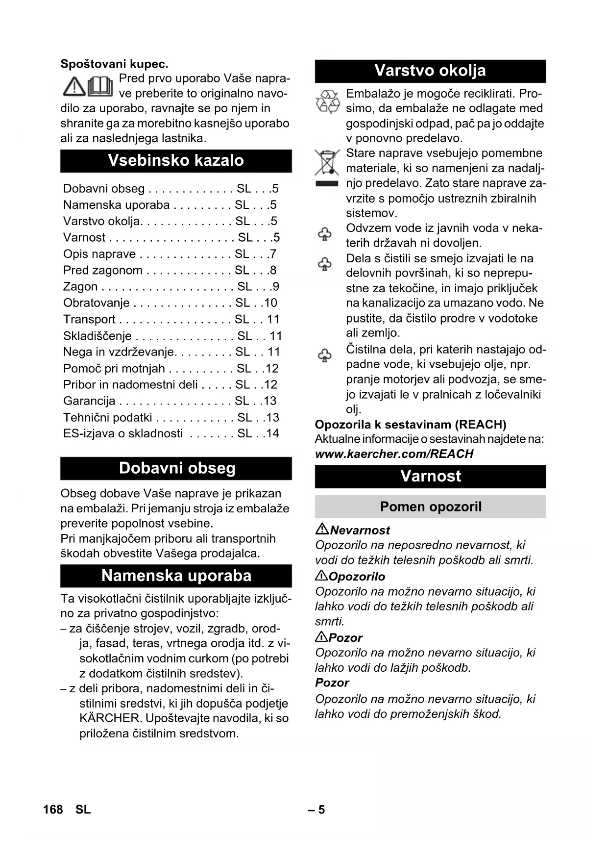 92 dB(A) Technické změny jsou vyhrazeny. Prohlášení o shodě pro ES Výrobek: Vysokotlaký čistič Typ: 1.180-xxx Příslušné směrnice ES: 2000/14/ES 2004/108/ES 2006/42/ES (+2009/127/ES) 2011/65/EU Použité harmonizační normy EN 50581 EN 55014–1: 2006+A1: 2009+A2: 2011 EN 55014–2: 1997+A1: 2001+A2: 2008 EN 60335–1 EN 60335–2–79 EN 61000–3–2: 2006+A1: 2009+A2: 2009 EN 61000–3–3: 2008 EN 62233: 2008 Použitý postup posuzování shody: 2000/14/ES: Příloha V Hladinu akustického dB(A) Namerenou: 89 Garantovanou: 92 Winnenden, 2013/09/01 CEO Head of Approbation 167CS– 5 Spoštovani kupec. Pred prvo uporabo Vaše napra- ve preberite to originalno navo- dilo za uporabo, ravnajte se po njem in shranite ga za morebitno kasnejšo uporabo ali za naslednjega lastnika. Obseg dobave Vaše naprave je prikazan na embalaži. Pri jemanju stroja iz embalaže preverite popolnost vsebine. Pri manjkajočem priboru ali transportnih škodah obvestite Vašega prodajalca. Ta visokotlačni čistilnik uporabljajte izključ- no za privatno gospodinjstvo: – za čiščenje strojev, vozil, zgradb, orod- ja, fasad, teras, vrtnega orodja itd. z vi- sokotlačnim vodnim curkom (po potrebi z dodatkom čistilnih sredstev). – z deli pribora, nadomestnimi deli in či- stilnimi sredstvi, ki jih dopušča podjetje KÄRCHER. Upoštevajte navodila, ki so priložena čistilnim sredstvom. Embalažo je mogoče reciklirati. Pro- simo, da embalaže ne odlagate med gospodinjski odpad, pač pa jo oddajte v ponovno predelavo. Stare naprave vsebujejo pomembne materiale, ki so namenjeni za nadalj- njo predelavo. Zato stare naprave za- vrzite s pomočjo ustreznih zbiralnih sistemov. Odvzem vode iz javnih voda v neka- terih državah ni dovoljen. Dela s čistili se smejo izvajati le na delovnih površinah, ki so neprepu- stne za tekočine, in imajo priključek na kanalizacijo za umazano vodo. Ne pustite, da čistilo prodre v vodotoke ali zemljo. Čistilna dela, pri katerih nastajajo od- padne vode, ki vsebujejo olje, npr. pranje motorjev ali podvozja, se sme- jo izvajati le v pralnicah z ločevalniki olj. Opozorila k sestavinam (REACH) Aktualne informacije o sestavinah najdete na: www.kaercher.com/REACH Nevarnost Opozorilo na neposredno nevarnost, ki vodi do težkih telesnih poškodb ali smrti. 몇 Opozorilo Opozorilo na možno nevarno situacijo, ki lahko vodi do težkih telesnih poškodb ali smrti. 몇 Pozor Opozorilo na možno nevarno situacijo, ki lahko vodi do lažjih poškodb. Pozor Opozorilo na možno nevarno situacijo, ki lahko vodi do premoženjskih škod. Vsebinsko kazalo Dobavni obseg . . . . . . . . . . . . . SL . . .5 Namenska uporaba . . . . . . . . . SL . . .5 Varstvo okolja. . . . . . . . . . . . . . SL . . .5 Varnost . . . . . . . . . . . . . . . . . . . SL . . .5 Opis naprave . . . . . . . . . . . . . . SL . . .7 Pred zagonom . . . . . . . . . . . . . SL . . .8 Zagon . . . . . . . . . . . . . . . . . . . . SL . . .9 Obratovanje . . . . . . . . . . . . . . . SL . .10 Transport . . . . . . . . . . . . . . . . . SL . . 11 Skladiščenje . . . . . . . . . . . . . . . SL . . 11 Nega in vzdrževanje. . . . . . . . . SL . . 11 Pomoč pri motnjah . . . . . . . . . . SL . .12 Pribor in nadomestni deli . . . . . SL . .12 Garancija . . . . . . . . . . . . . . . . . SL . .13 Tehnični podatki . . . . . . . . . . . . SL . .13 ES-izjava o skladnosti . . . . . . . SL . .14 Dobavni obseg Namenska uporaba Varstvo okolja Varnost Pomen opozoril 168 SL– 6 Visokotlačnega curka ne usmerjajte v osebe, živali, ak- tivno električno opremo ali na samo napravo. Napravo zaščitite pred zmrzaljo. Naprave se ne sme priključiti ne- posredno na javno omrežje pitne vode. Nevarnost Električnega vtiča in vtičnice nikoli ne prijemajte z vlažnimi rokami. Pred vsako uporabo preverite električni priključni kabel z električnim vtičem gle- de poškodb. Poškodovani električni pri- ključni kabel mora pooblaščena servi- sna služba / električar nemudoma za- menjati. Ne uporabljajte naprave s po- škodovanim električnim priključnim ka- blom. Vsi deli v delovnem območju, ki so pod napetostjo, morajo biti zaščiteni pred vodnim curkom. Električni vtiči in spojke podaljševalne- ga kabla morajo biti vodotesni in ne smejo ležati v vodi. Spojka nadalje ne sme ležati na tleh. Priporoča se, da uporabljate bobne za kable, ki zagota- vljajo, da se vtičnice nahajajo najmanj 60 mm nad tlemi. Pazite na to, da električnega priključne- ga kabla ali podaljševalnega kabla ne poškodujete s prevoženjem, stisnje- njem, vlečenjem ali podobnim. Električ- ne kable zaščitite pred vročino, oljem in ostrimi robovi. 몇 Opozorilo Napravo priključite le na izmenični tok. Napetost se mora ujemati s tipsko plo- ščico naprave. Napravo se sme priključiti le na električ- ni priključek, ki ga je elektro inštalater izvedel v skladu z IEC 60364. Neustrezni električni podaljševalni kabli so lahko nevarni. Na prostem upora- bljajte le atestirane in ustrezno označe- ne električne podaljševalne kable z za- dostnim presekom kabla: 1 - 10 m: 1,5