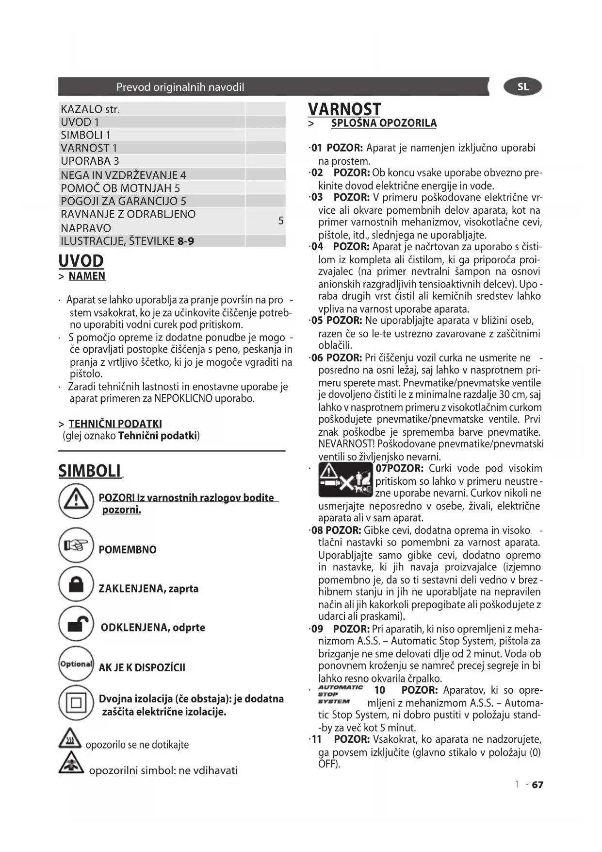 - 09 POZOR: Pri aparatih, ki niso opremljeni z meha- nizmom A.S.S. – Automatic Stop System, pištola za brizganje ne sme delovati dlje od 2 minut. Voda ob ponovnem kroženju se namreč precej segreje in bi lahko resno okvarila črpalko.
