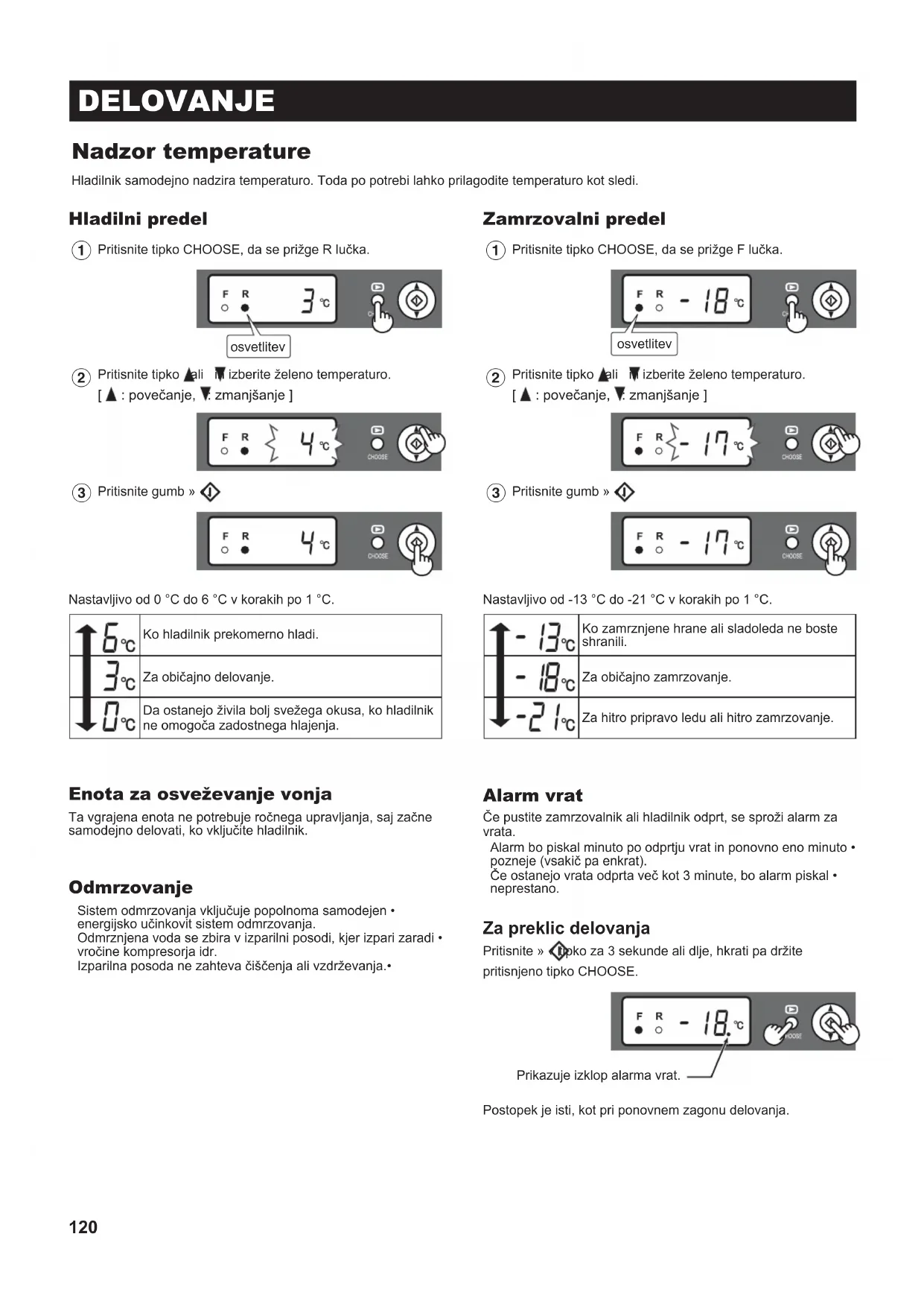 3 Pritisnite gumb » «.Nastavljivo od -13 °C do -21 °C v korakih po 1 °C.Ko zamrznjene hrane ali sladoleda ne boste shranili.Za običajno zamrzovanje.Za hitro pripravo ledu ali hitro zamrzovanje. Alarm vrat Če pustite zamrzovalnik ali hladilnik odprt, se sproži alarm za vrata.Alarm bo piskal minuto po odprtju vrat in ponovno eno minuto • pozneje (vsakič pa enkrat).Če ostanejo vrata odprta več kot 3 minute, bo alarm piskal • neprestano. Za preklic delovanja Pritisnite » « tipko za 3 sekunde ali dlje, hkrati pa držite pritisnjeno tipko CHOOSE.Postopek je isti, kot pri ponovnem zagonu delovanja.osvetlitevPrikazuje izklop alarma vrat. (B486)E3.indb120(B486)E3.indb120 2013/10/2814:36:362013/10/2814:36:36121