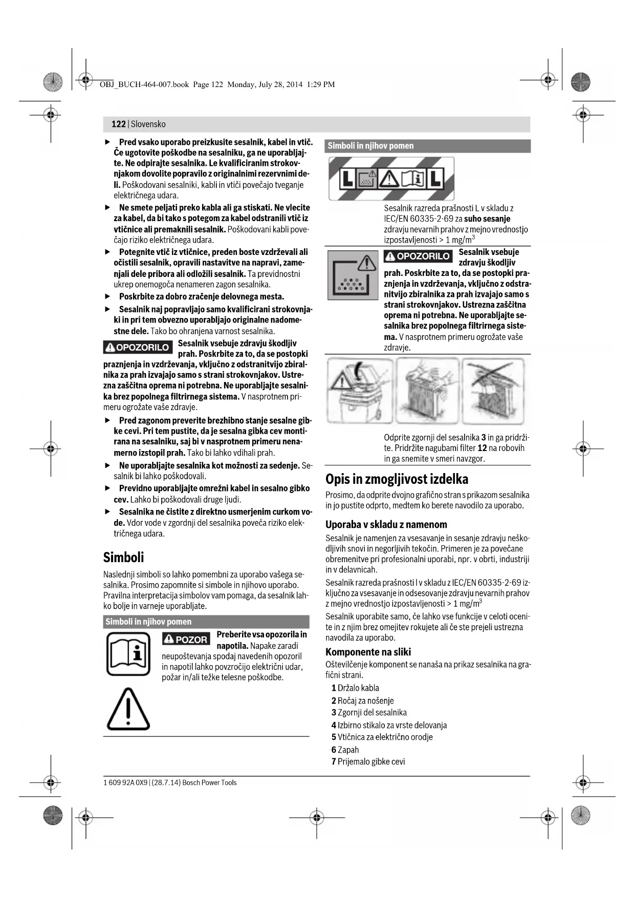 OPOZORILO OPOZORILO OPOZORILO OPOZORILO OBJ_BUCH-464-007.book Page 121 Monday, July 28, 2014 1:29 PM122 | Slovensko 1 609 92A 0X9 | (28.7.14) Bosch Power Tools Pred vsako uporabo preizkusite sesalnik, kabel in vtič.