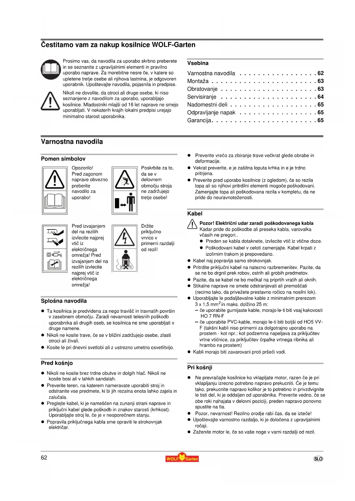 - Čestitamo vam za nakup kosilnice WOLF-Garten Vsebina Varnostna navodila p. 62