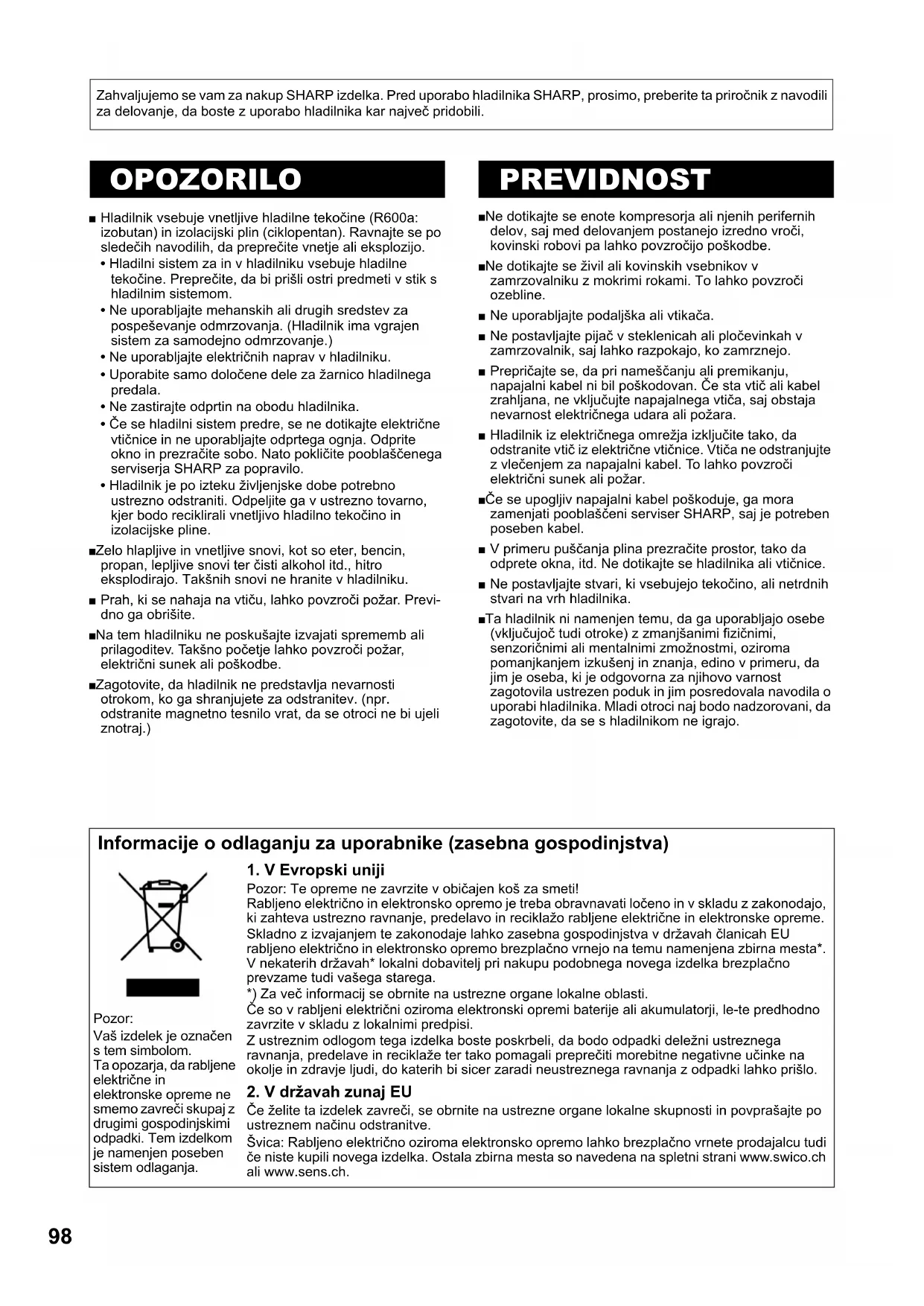 Zahvaljujemo se vam za nakup SHARP izdelka. Pred uporabo hladilnika SHARP, prosimo, preberite ta priročnik z navodili