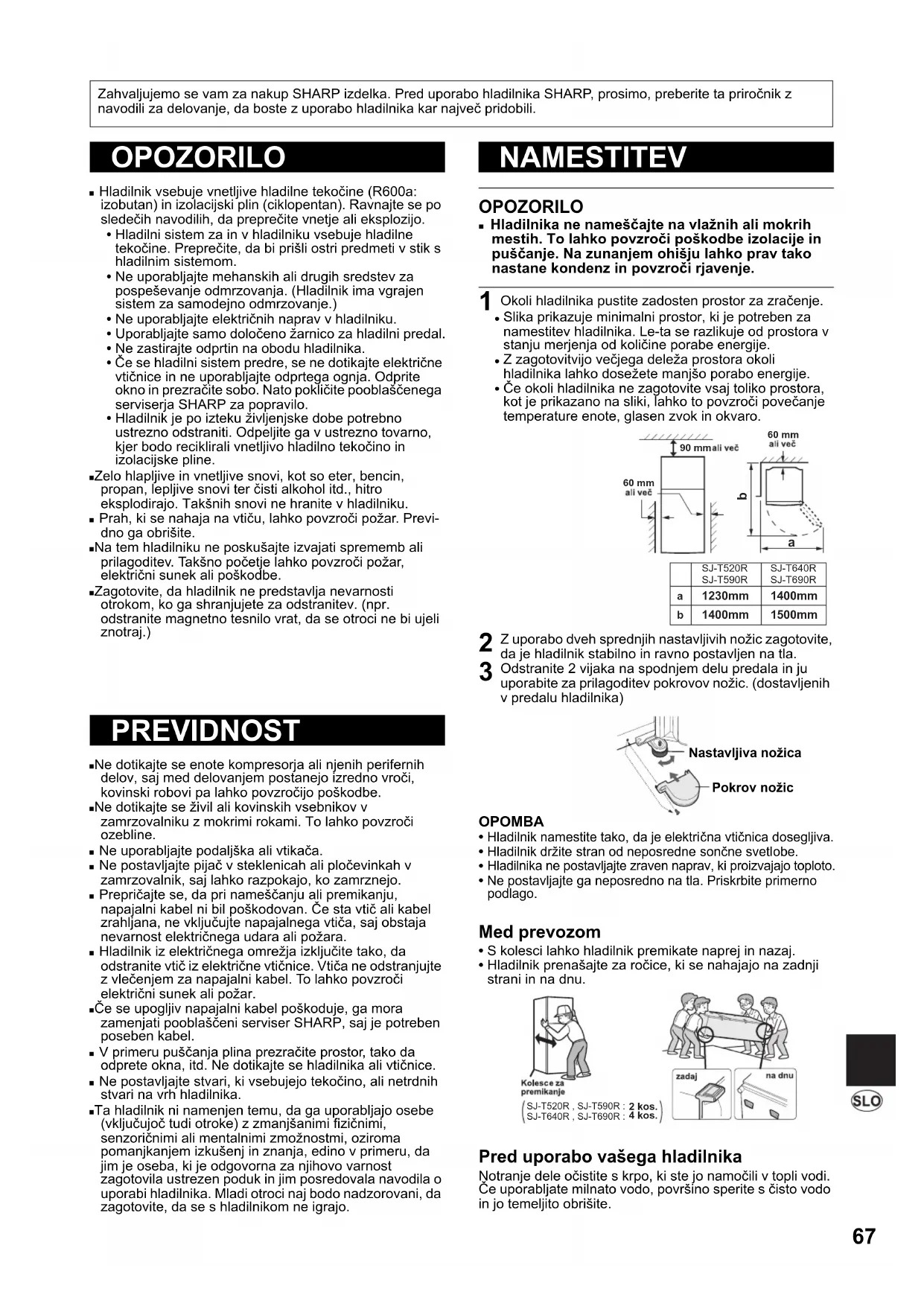 • Uporabljajte samo določeno žarnico za hladilni predal. • Ne zastirajte odprtin na obodu hladilnika. • Če se hladilni sistem predre, se ne dotikajte električne vtičnice in ne uporabljajte odprtega ognja. Odprite okno in prezračite sobo. Nato pokličite pooblaščenega serviserja SHARP za popravilo.• Hladilnik je po izteku življenjske dobe potrebno ustrezno odstraniti. Odpeljite ga v ustrezno tovarno, kjer bodo reciklirali vnetljivo hladilno tekočino in izolacijske pline.■ Zelo hlapljive in vnetljive snovi, kot so eter, bencin, propan, lepljive snovi ter čisti alkohol itd., hitro eksplodirajo. Takšnih snovi ne hranite v hladilniku. ■ Prah, ki se nahaja na vtiču, lahko povzroči požar. Previ- dno ga obrišite.■ Na tem hladilniku ne poskušajte izvajati sprememb ali prilagoditev. Takšno početje lahko povzroči požar, električni sunek ali poškodbe. ■ Zagotovite, da hladilnik ne predstavlja nevarnosti otrokom, ko ga shranjujete za odstranitev. (npr. odstranite magnetno tesnilo vrat, da se otroci ne bi ujeli znotraj.) ■ Ne dotikajte se enote kompresorja ali njenih perifernih delov, saj med delovanjem postanejo izredno vroči, kovinski robovi pa lahko povzročijo poškodbe.■ Ne dotikajte se živil ali kovinskih vsebnikov v zamrzovalniku z mokrimi rokami. To lahko povzroči ozebline. ■ Ne uporabljajte podaljška ali vtikača.