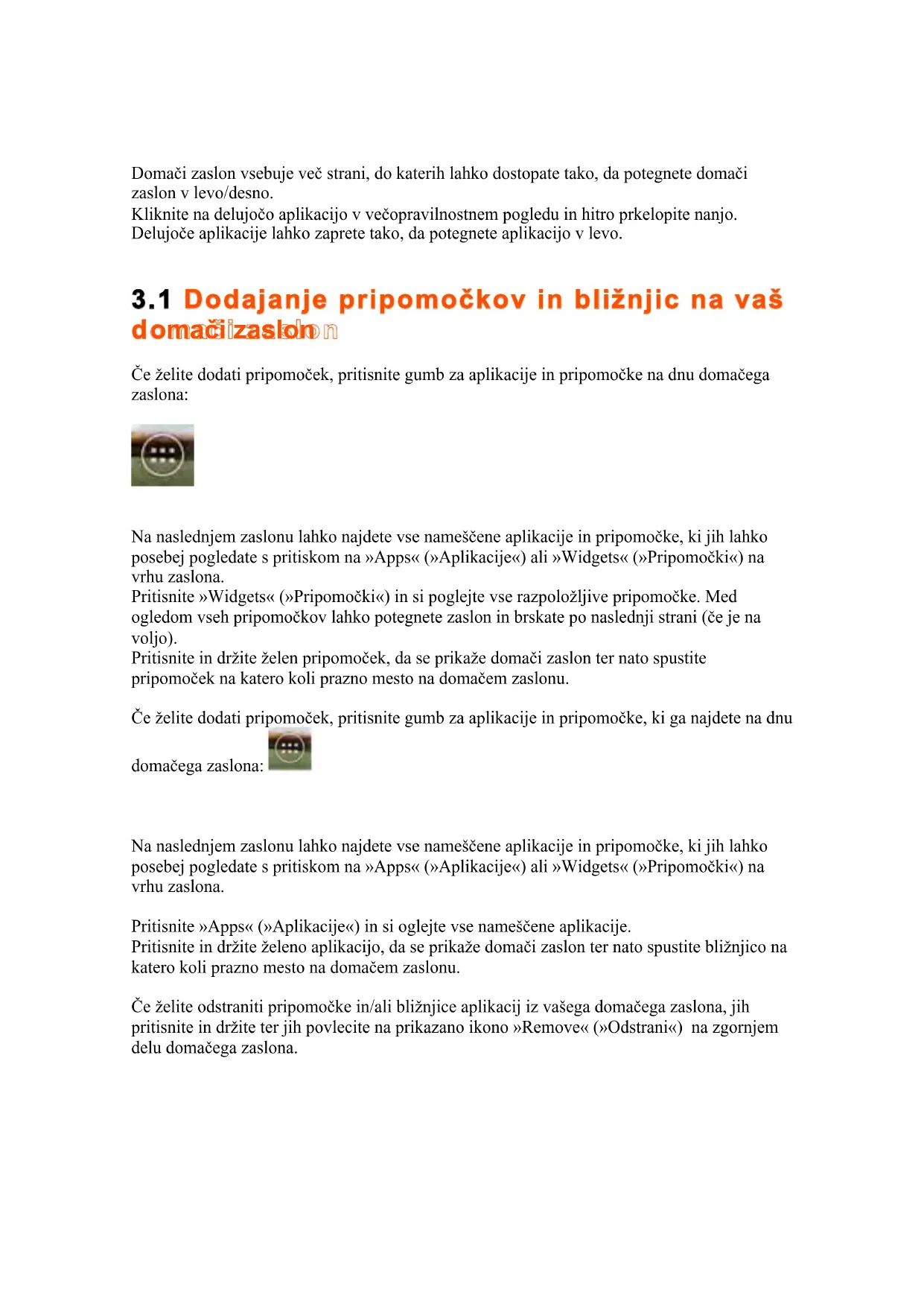 Na naslednjem zaslonu lahko najdete vse name!"ene aplikacije in pripomo"ke, ki jih lahko posebej pogledate s pritiskom na »Apps« (»Aplikacije«) ali »Widgets« (»Pripomo"ki«) na vrhu zaslona. Pritisnite »Apps« (»Aplikacije«) in si oglejte vse name!"ene aplikacije. Pritisnite in dr#ite #eleno aplikacijo, da se prika#e doma"i zaslon ter nato spustite bli#njico na katero koli prazno mesto na doma"em zaslonu. $e #elite odstraniti pripomo"ke in/ali bli#njice aplikacij iz va!ega doma"ega zaslona, jih pritisnite in dr#ite ter jih povlecite na prikazano ikono »Remove« (»Odstrani«) na zgornjem delu doma"ega zaslona.3.2 Nastavitev ozadja $e #elite spremeniti ozadje doma"ega zaslona, pritisnite in dr#ite doma"i zaslon, dokler se ne pojavi meni »Choose Wallpaper from« (»Izberite ozadje iz«). Izberete lahko iz »Gallery« (»Galerija«) (posnetki), »Live Wallpapers« (»%iva ozadja«) (animirana ozadja), »Wallpapers« (»Ozadja«) (privzete stati"ne slike).
