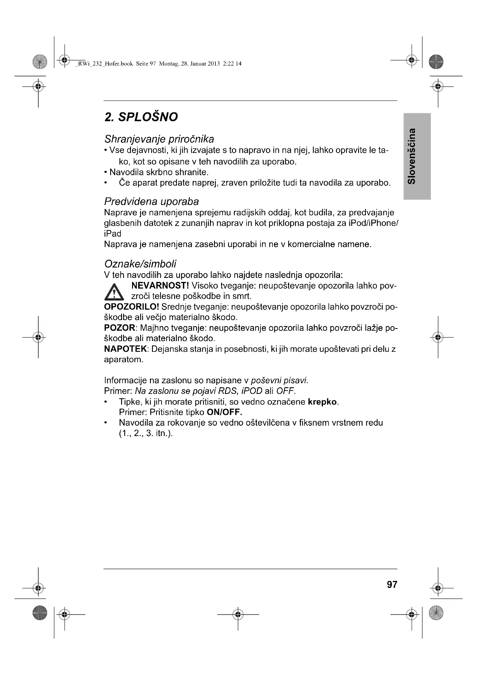 - Navodila za rokovanje so vedno oštevilčena v fiksnem vrstnem redu (1., 2., 3. itn.). _RWi_232_Hofer.book Seite 97 Montag, 28. Januar 2013 2:22 1498