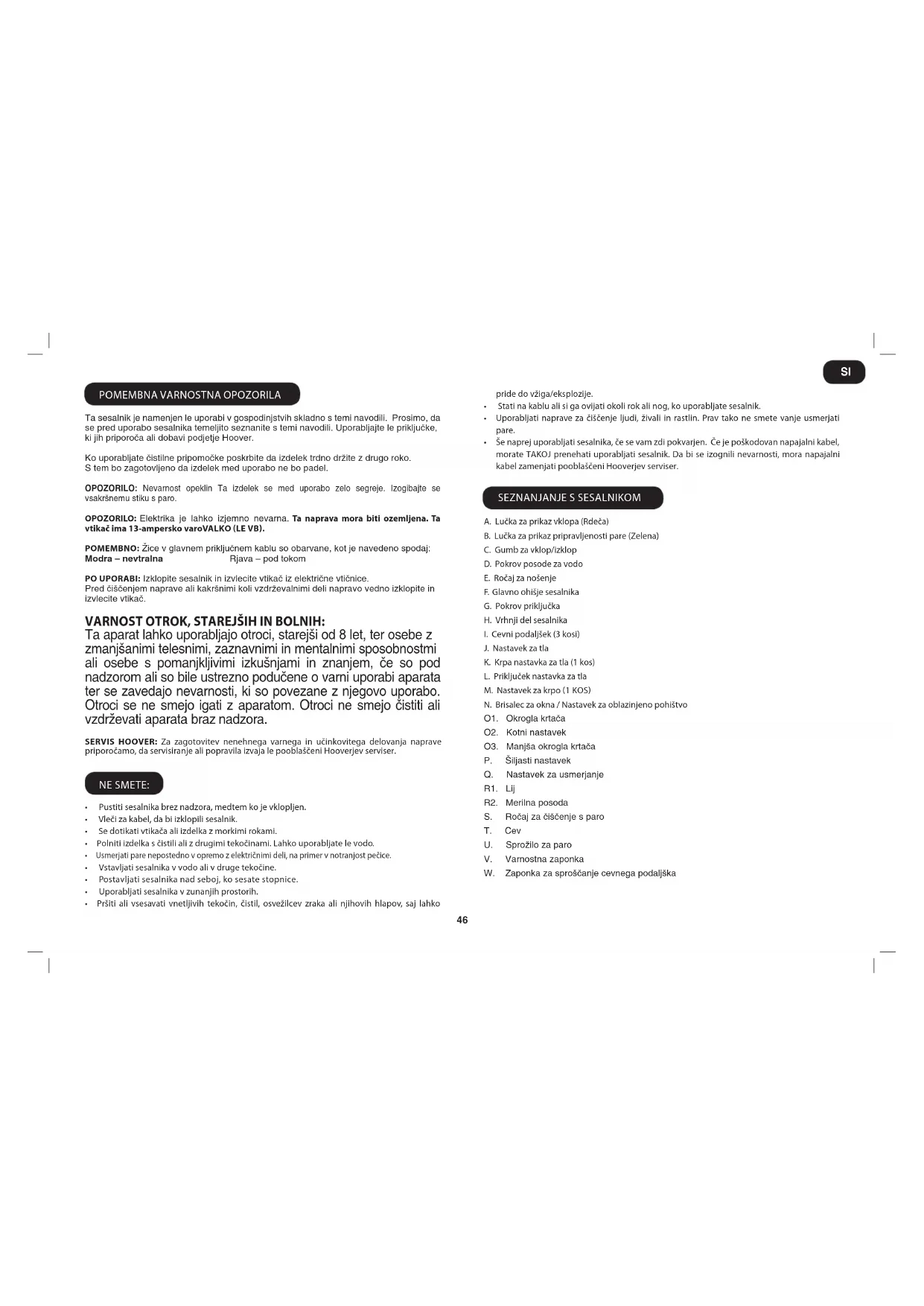 Ta sesalnik je namenjen le uporabi v gospodinjstvih skladno s temi navodili. Prosimo, da se pred uporabo sesalnika temeljito seznanite s temi navodili. Uporabljajte le priključke, ki jih priporoča ali dobavi podjetje Hoover. Ko uporabljate čistilne pripomočke poskrbite da izdelek trdno držite z drugo roko. S tem bo zagotovljeno da izdelek med uporabo ne bo padel. opoZoRIlo: Nevarnost opeklin Ta izdelek se med uporabo zelo segreje. Izogibajte se vsakršnemu stiku s paro. OPOZORILO: Elektrika je lahko izjemno nevarna. Ta naprava mora biti ozemljena. Ta vtikač ima 13-ampersko varoVALKO LE VB. POMEMBNO: Žice v glavnem priključnem kablu so obarvane, kot je navedeno spodaj: Modra – nevtralna Rjava – pod tokom PO UPORABI: Izklopite sesalnik in izvlecite vtikač iz električne vtičnice. Pred čiščenjem naprave ali kakršnimi koli vzdrževalnimi deli napravo vedno izklopite in izvlecite vtikač. VARNOST OTROK, STAREJŠIH IN BOLNIH: Ta aparat lahko uporabljajo otroci, starejši od 8 let, ter osebe z zmanjšanimi telesnimi, zaznavnimi in mentalnimi sposobnostmi ali osebe s pomanjkljivimi izkušnjami in znanjem, če so pod nadzorom ali so bile ustrezno podučene o varni uporabi aparata ter se zavedajo nevarnosti, ki so povezane z njegovo uporabo. Otroci se ne smejo igati z aparatom. Otroci ne smejo čistiti ali vzdrževati aparata braz nadzora. SERVIS HOOVER: Za zagotovitev nenehnega varnega in učinkovitega delovanja naprave priporočamo, da servisiranje ali popravila izvaja le pooblaščeni Hooverjev serviser. NE SMETE: