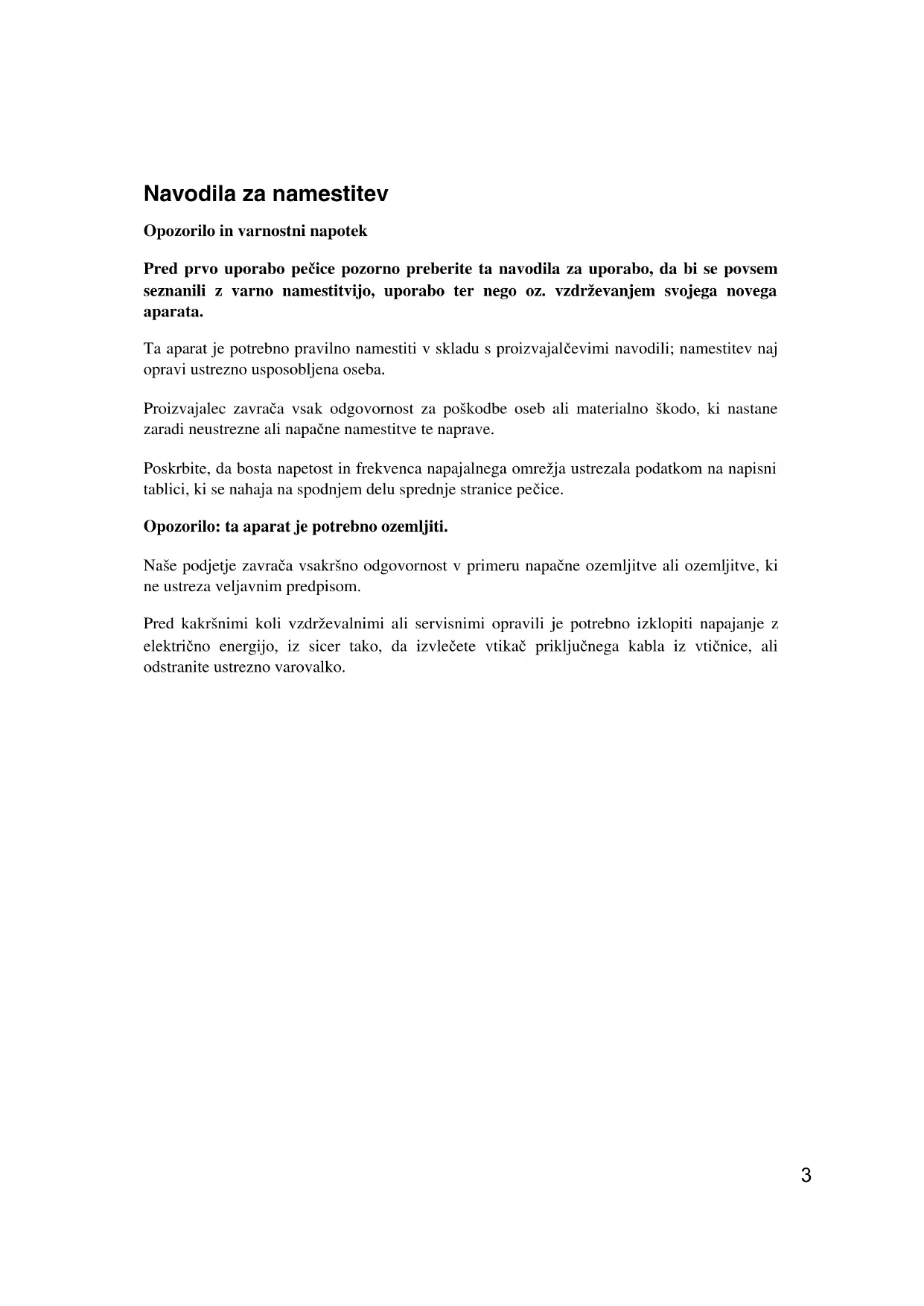 - da je na napajalni elektri čni sistem opremljen z delujočim učinkovitim ozemljitvenim vodom ter da je vtičnica ali vse-polarno (omnipolarno) stikalo z razmikom med kontakti vsaj 3 mm po namestitvi aparata lahko dostopno.