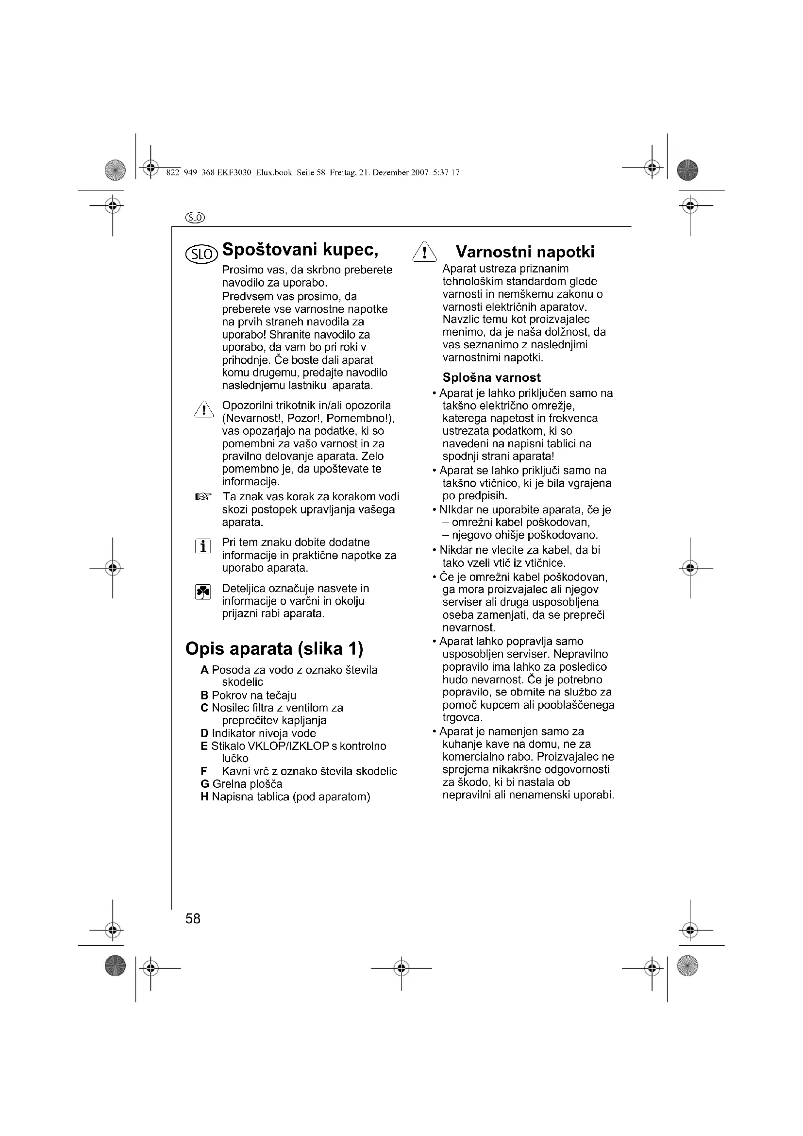 - Če je omrežni kabel poškodovan, ga mora proizvajalec ali njegov serviser ali druga usposobljena oseba zamenjati, da se prepreči nevarnost.• Aparat lahko popravlja samo usposobljen serviser. Nepravilno popravilo ima lahko za posledico hudo nevarnost. Če je potrebno popravilo, se obrnite na službo za pomoč kupcem ali pooblaščenega trgovca.• Aparat je namenjen samo za kuhanje kave na domu, ne za komercialno rabo. Proizvajalec ne sprejema nikakršne odgovornosti za škodo, ki bi nastala ob nepravilni ali nenamenski uporabi.822_949_368 EKF3030_Elux.book Seite 58 Freitag, 21. Dezember 2007 5:37 17x