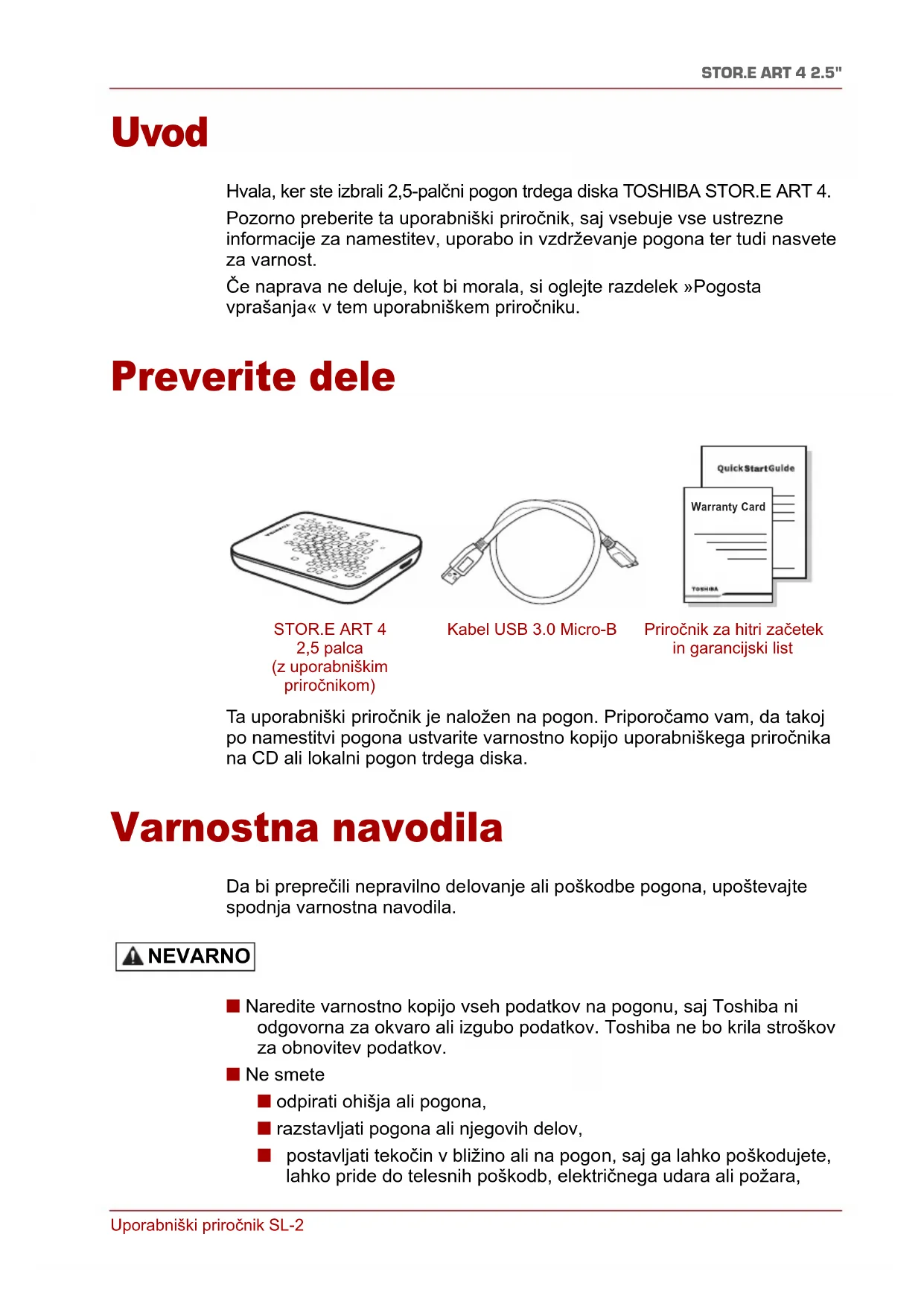 2,5 palca (z uporabniškim priročnikom) Kabel USB 3.0 Micro-B Priročnik za hitri začetek in garancijski list NEVARNOUporabniški priročnik SL-3