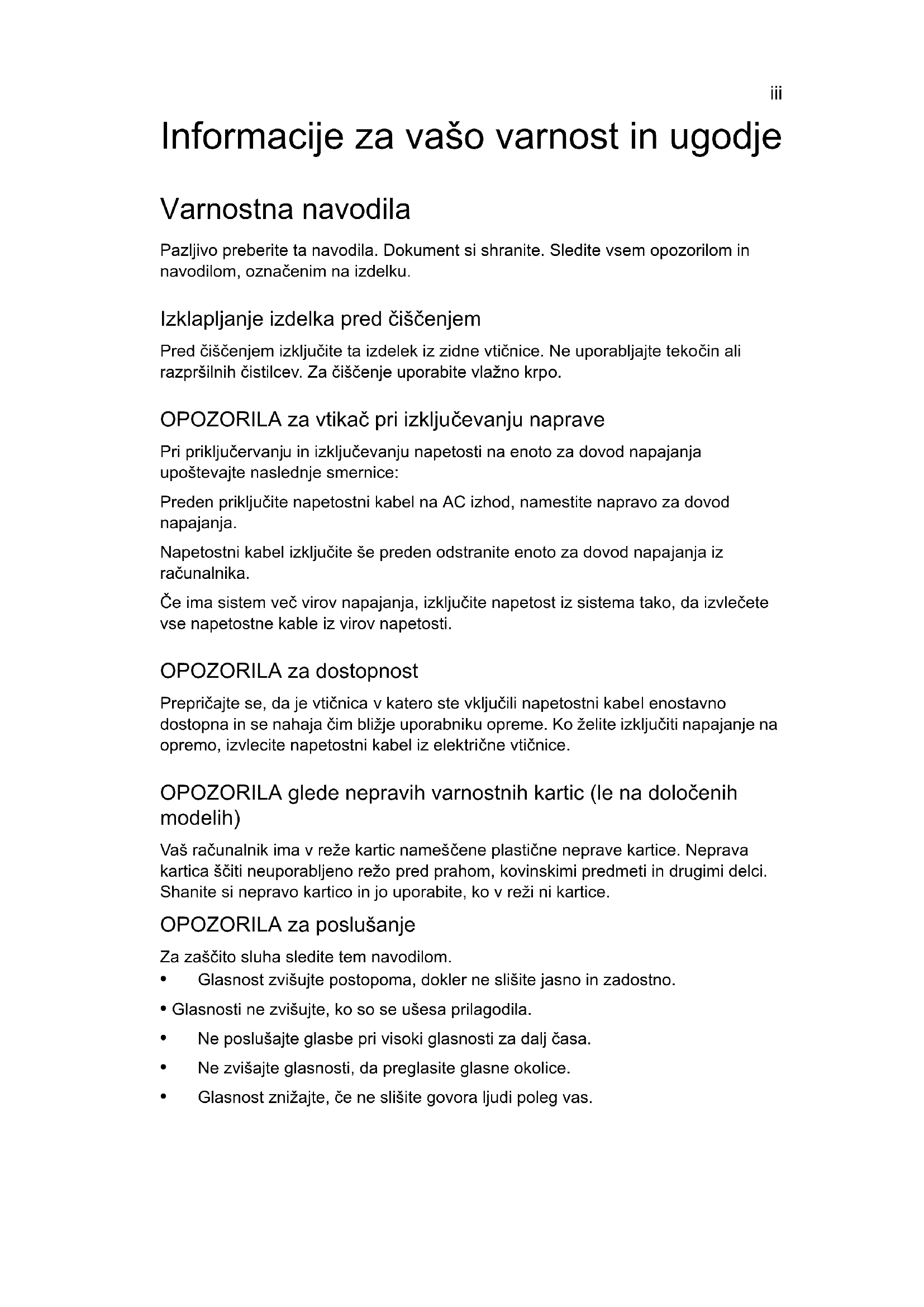zvuk riešenie problémov . . . . . . . . . 8Serija Aspire One Splošni uporabniški priročnikŠtevilka modela: _______________________________ Serijska številka: _______________________________ Datum nakupa: ________________________________ Mesto nakupa: _________________________________ © 2010 Vse pravice pridržane Splošni uporabniški priročnike za serijo Aspire One Izvorna izdaja: 06/2010 Prenosni računalnike serije Aspire Oneiii Informacije za vašo varnost in ugodje Varnostna navodila Pazljivo preberite ta navodila. Dokument si shranite. Sledite vsem opozorilom in navodilom, označenim na izdelku. Izklapljanje izdelka pred čiščenjem Pred čiščenjem izključite ta izdelek iz zidne vtičnice. Ne uporabljajte tekočin ali razpršilnih čistilcev. Za čiščenje uporabite vlažno krpo. OPOZORILA za vtikač pri izključevanju naprave Pri priključervanju in izključevanju napetosti na enoto za dovod napajanja upoštevajte naslednje smernice: Preden priključite napetostni kabel na AC izhod, namestite napravo za dovod napajanja. Napetostni kabel izključite še preden odstranite enoto za dovod napajanja iz računalnika. Če ima sistem več virov napajanja, izključite napetost iz sistema tako, da izvlečete vse napetostne kable iz virov napetosti. OPOZORILA za dostopnost Prepričajte se, da je vtičnica v katero ste vključili napetostni kabel enostavno dostopna in se nahaja čim bližje uporabniku opreme. Ko želite izključiti napajanje na opremo, izvlecite napetostni kabel iz električne vtičnice. OPOZORILA glede nepravih varnostnih kartic (le na določenih modelih) Vaš računalnik ima v reže kartic nameščene plastične neprave kartice. Neprava kartica ščiti neuporabljeno režo pred prahom, kovinskimi predmeti in drugimi delci. Shanite si nepravo kartico in jo uporabite, ko v reži ni kartice. OPOZORILA za poslušanje Za zaščito sluha sledite tem navodilom.