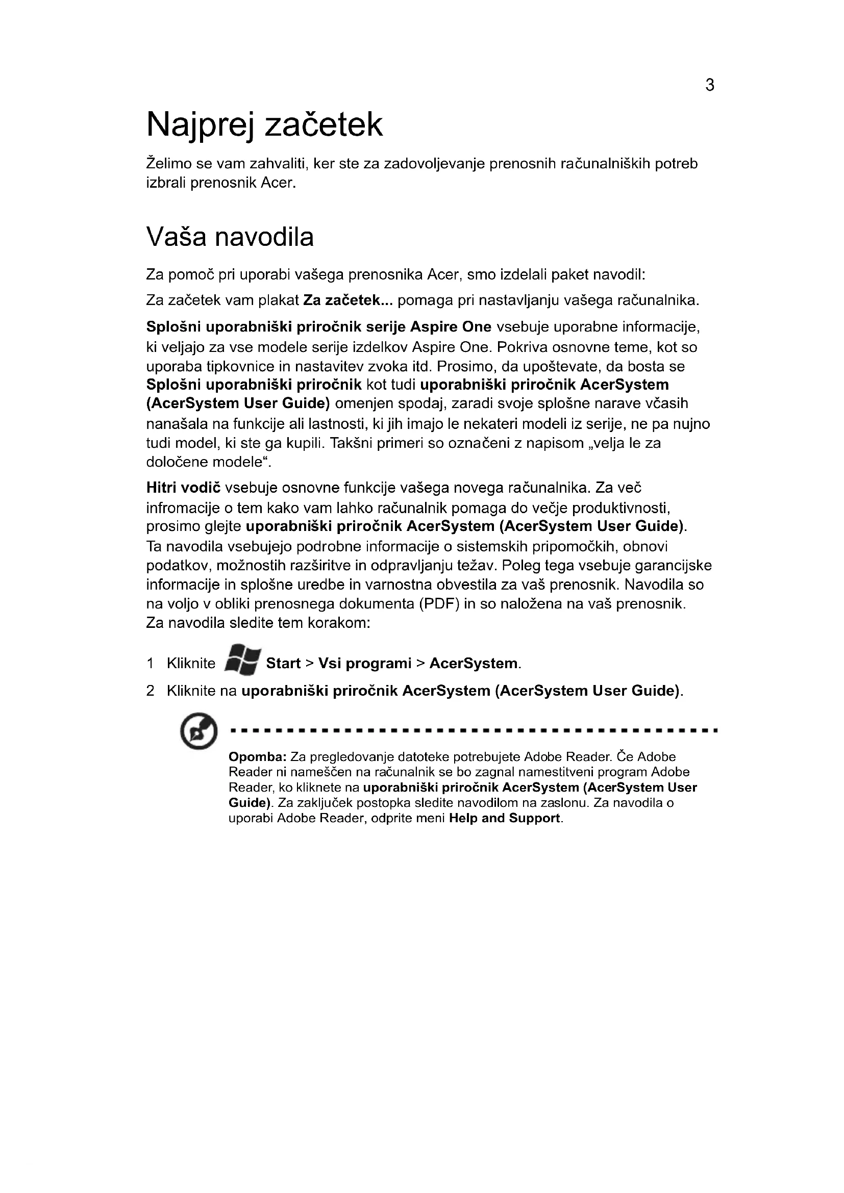 6Serija Aspire One Hitri vodičŠtevilka modela: _______________________________ Serijska številka: _______________________________ Datum nakupa: ________________________________ Mesto nakupa: _________________________________ © 2010 Vse pravice pridržane. Hitri vodič za serijo Aspire One Originalna izdaja: 11/2010 Prenosni računalnik serije Aspire One3 Najprej začetek Želimo se vam zahvaliti, ker ste za zadovoljevanje prenosnih računalniških potreb izbrali prenosnik Acer. Vaša navodila Za pomoč pri uporabi vašega prenosnika Acer, smo izdelali paket navodil: Za začetek vam plakat Za začetek... pomaga pri nastavljanju vašega računalnika. Splošni uporabniški priročnik serije Aspire One vsebuje uporabne informacije, ki veljajo za vse modele serije izdelkov Aspire One. Pokriva osnovne teme, kot so uporaba tipkovnice in nastavitev zvoka itd. Prosimo, da upoštevate, da bosta se Splošni uporabniški priročnik kot tudi uporabniški priročnik AcerSystem (AcerSystem User Guide) omenjen spodaj, zaradi svoje splošne narave včasih nanašala na funkcije ali lastnosti, ki jih imajo le nekateri modeli iz serije, ne pa nujno tudi model, ki ste ga kupili. Takšni primeri so označeni z napisom „velja le za določene modele“. Hitri vodič vsebuje osnovne funkcije vašega novega računalnika. Za več infromacije o tem kako vam lahko računalnik pomaga do večje produktivnosti, prosimo glejte uporabniški priročnik AcerSystem (AcerSystem User Guide). Ta navodila vsebujejo podrobne informacije o sistemskih pripomočkih, obnovi podatkov, možnostih razširitve in odpravljanju težav. Poleg tega vsebuje garancijske informacije in splošne uredbe in varnostna obvestila za vaš prenosnik. Navodila so na voljo v obliki prenosnega dokumenta (PDF) in so naložena na vaš prenosnik. Za navodila sledite tem korakom: 1 Kliknite Start > Vsi programi > AcerSystem. 2 Kliknite na uporabniški priročnik AcerSystem (AcerSystem User Guide). Opomba: Za pregledovanje datoteke potrebujete Adobe Reader. Če Adobe Reader ni nameščen na računalnik se bo zagnal namestitveni program Adobe Reader, ko kliknete na uporabniški priročnik AcerSystem (AcerSystem User Guide). Za zaključek postopka sledite navodilom na zaslonu. Za navodila o uporabi Adobe Reader, odprite meni Help and Support.4 Slovenski Vodič po vašem prenosniku Acer Ko ste nastavili računalnik, kot je prikazano na plakatu z navodili za nastavitev, dovolite, da vam predstavimo vaš novi prenosnik Acer. Pogled od zgoraj # Ikona Predmet Opis1 Mikrofon Notranji mikrofon za snemanje zvoka.2 Zaslon Takoimenovani zaslon s tekoimi kristali (LCD), prikazuje izhod vašega raunalnika (konfiguracija je za razline modele razlina).3 Tipka za vklop/izklopVklop in izklop računalnika.