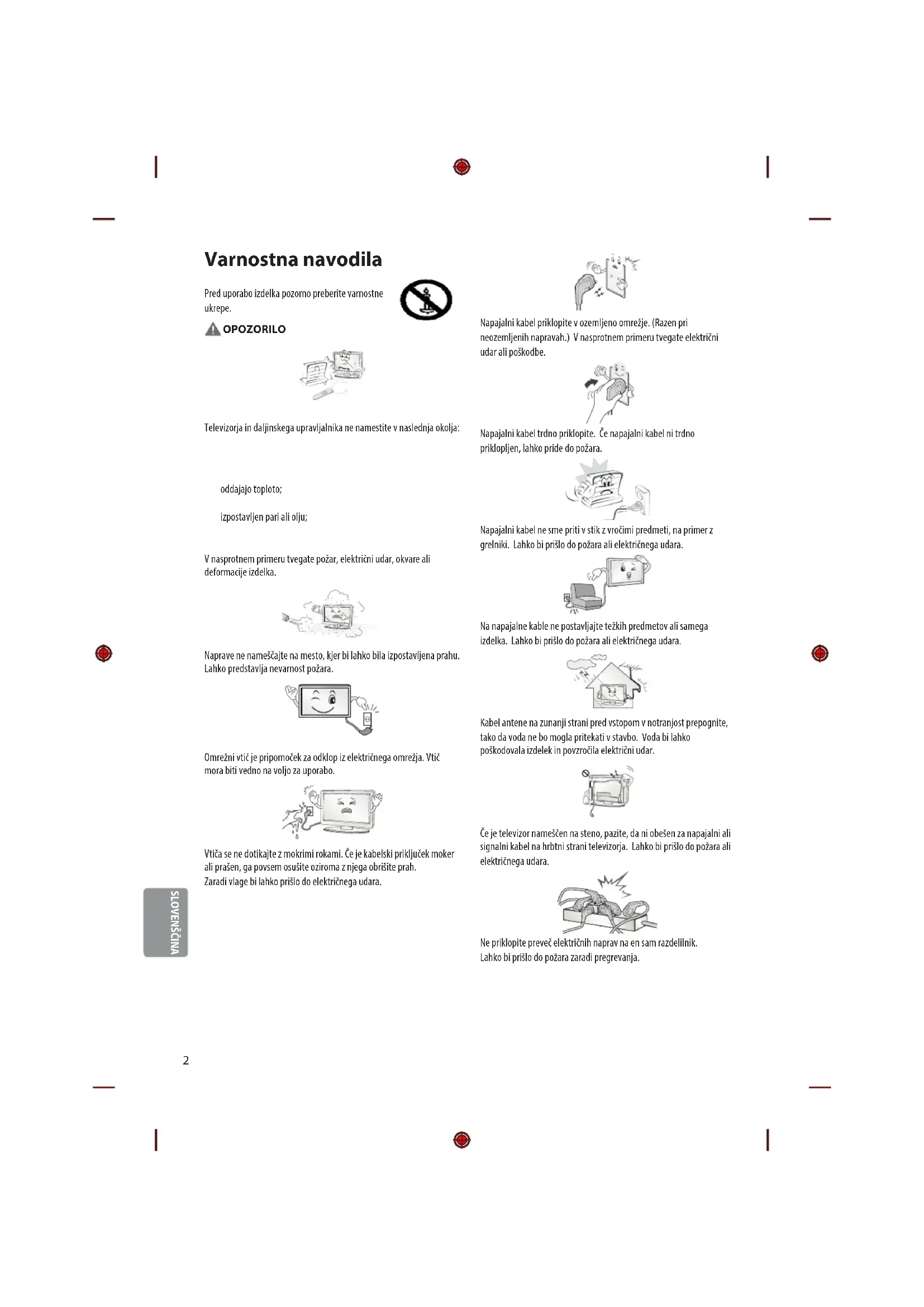 - LG-jevi televizorji LED uporabljajo zaslon LCD in osvetlitev ozadja s tehnologijo LED.2 SLOVENŠČINA Varnostna navodila Pred uporabo izdelka pozorno preberite varnostne ukrepe. OPOZORILO Televizorja in daljinskega upravljalnika ne namestite v naslednja okolja: tna neposredno sončno svetlobo; tv prostor z visoko zračno vlažnostjo, kot je kopalnica; tv bližino virov toplote, kot so štedilniki in druge naprave, ki oddajajo toploto; tv bližino kuhinjskih pultov ali vlažilnikov zraka, kjer bi lahko izpostavljen pari ali olju; tv območje, kjer bi bil izpostavljen dežju ali vetru; tv bližino posod z vodo, kot so vaze. V nasprotnem primeru tvegate požar, električni udar, okvare ali deformacije izdelka. Naprave ne nameščajte na mesto, kjer bi lahko bila izpostavljena prahu. Lahko predstavlja nevarnost požara. Omrežni vtič je pripomoček za odklop iz električnega omrežja. Vtič mora biti vedno na voljo za uporabo. Vtiča se ne dotikajte z mokrimi rokami. Če je kabelski priključek moker ali prašen, ga povsem osušite oziroma z njega obrišite prah. Zaradi vlage bi lahko prišlo do električnega udara. Napajalni kabel priklopite v ozemljeno omrežje. (Razen pri neozemljenih napravah.) V nasprotnem primeru tvegate električni udar ali poškodbe. Napajalni kabel trdno priklopite. Če napajalni kabel ni trdno priklopljen, lahko pride do požara. Napajalni kabel ne sme priti v stik z vročimi predmeti, na primer z grelniki. Lahko bi prišlo do požara ali električnega udara. Na napajalne kable ne postavljajte težkih predmetov ali samega izdelka. Lahko bi prišlo do požara ali električnega udara. Kabel antene na zunanji strani pred vstopom v notranjost prepognite, tako da voda ne bo mogla pritekati v stavbo. Voda bi lahko poškodovala izdelek in povzročila električni udar. Če je televizor nameščen na steno, pazite, da ni obešen za napajalni ali signalni kabel na hrbtni strani televizorja. Lahko bi prišlo do požara ali električnega udara. Ne priklopite preveč električnih naprav na en sam razdelilnik. Lahko bi prišlo do požara zaradi pregrevanja.SLOVENŠČINA