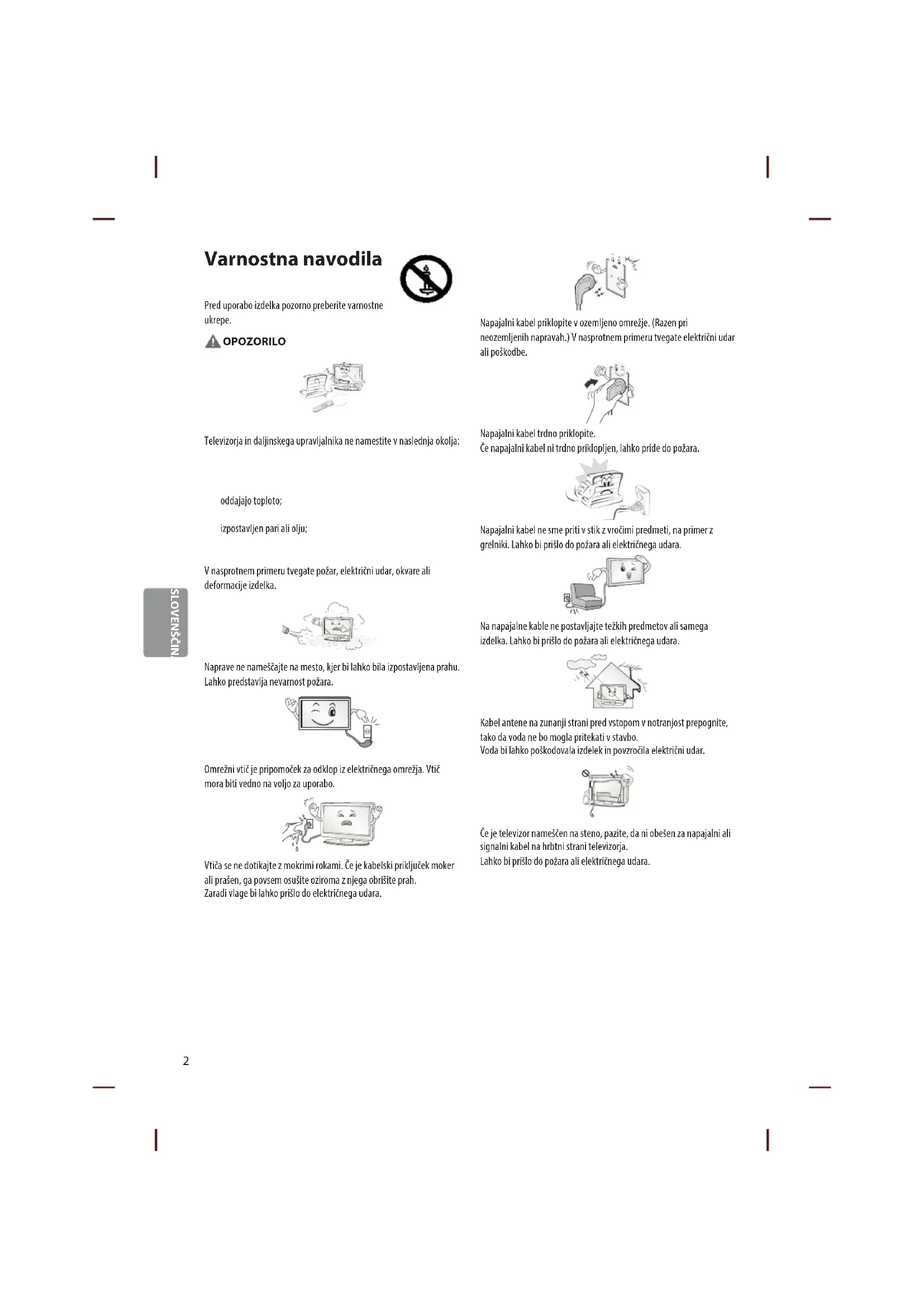 [BQSJIPEOKPVQPSBCP www.lg.com Varnostne informacije in napotki2 SLOVENŠČINA Varnostna navodila Pred uporabo izdelka pozorno preberite varnostne ukrepe. OPOZORILO Televizorja in daljinskega upravljalnika ne namestite v naslednja okolja: tna neposredno sončno svetlobo; tv prostor z visoko zračno vlažnostjo, kot je kopalnica; tv bližino virov toplote, kot so štedilniki in druge naprave, ki oddajajo toploto; tv bližino kuhinjskih pultov ali vlažilnikov zraka, kjer bi lahko izpostavljen pari ali olju; tv območje, kjer bi bil izpostavljen dežju ali vetru; tv bližino posod z vodo, kot so vaze. V nasprotnem primeru tvegate požar, električni udar, okvare ali deformacije izdelka. Naprave ne nameščajte na mesto, kjer bi lahko bila izpostavljena prahu. Lahko predstavlja nevarnost požara. Omrežni vtič je pripomoček za odklop iz električnega omrežja. Vtič mora biti vedno na voljo za uporabo. Vtiča se ne dotikajte z mokrimi rokami. Če je kabelski priključek moker ali prašen, ga povsem osušite oziroma z njega obrišite prah. Zaradi vlage bi lahko prišlo do električnega udara. Napajalni kabel priklopite v ozemljeno omrežje. (Razen pri neozemljenih napravah.) V nasprotnem primeru tvegate električni udar ali poškodbe. Napajalni kabel trdno priklopite. Če napajalni kabel ni trdno priklopljen, lahko pride do požara. Napajalni kabel ne sme priti v stik z vročimi predmeti, na primer z grelniki. Lahko bi prišlo do požara ali električnega udara. Na napajalne kable ne postavljajte težkih predmetov ali samega izdelka. Lahko bi prišlo do požara ali električnega udara. Kabel antene na zunanji strani pred vstopom v notranjost prepognite, tako da voda ne bo mogla pritekati v stavbo. Voda bi lahko poškodovala izdelek in povzročila električni udar. Če je televizor nameščen na steno, pazite, da ni obešen za napajalni ali signalni kabel na hrbtni strani televizorja. Lahko bi prišlo do požara ali električnega udara.SLOVENŠČINA