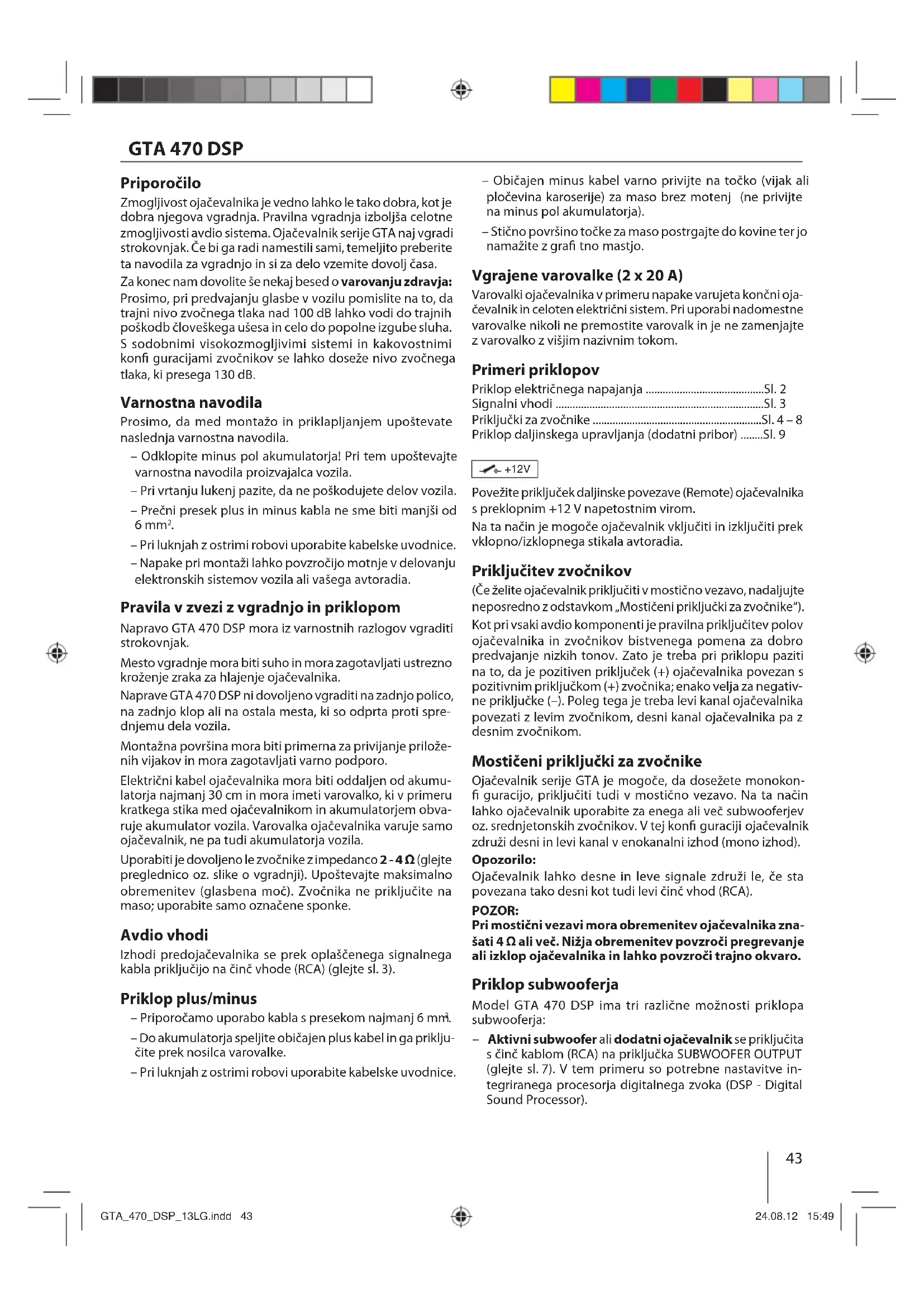 – Do akumulatorja speljite običajen plus kabel in ga priklju- čite prek nosilca varovalke. – Pri luknjah z ostrimi robovi uporabite kabelske uvodnice. – Običajen minus kabel varno privijte na točko (vijak ali pločevina karoserije) za maso brez motenj (ne privijte na minus pol akumulatorja). – Stično površino točke za maso postrgajte do kovine ter jo namažite z gra tno mastjo. Vgrajene varovalke (2 x 20 A) Varovalki ojačevalnika v primeru napake varujeta končni oja- čevalnik in celoten električni sistem. Pri uporabi nadomestne varovalke nikoli ne premostite varovalk in je ne zamenjajte z varovalko z višjim nazivnim tokom. Primeri priklopov Priklop električnega napajanja ..........................................Sl. 2 Signalni vhodi ..........................................................................Sl. 3 Priključki za zvočnike ............................................................Sl. 4 – 8 Priklop daljinskega upravljanja (dodatni pribor) ........Sl. 9 +12V Povežite priključek daljinske povezave (Remote) ojačevalnika s preklopnim +12 V napetostnim virom. Na ta način je mogoče ojačevalnik vključiti in izključiti prek vklopno/izklopnega stikala avtoradia. Priključitev zvočnikov (Če želite ojačevalnik priključiti v mostično vezavo, nadaljujte neposredno z odstavkom „Mostičeni priključki za zvočnike“). Kot pri vsaki avdio komponenti je pravilna priključitev polov ojačevalnika in zvočnikov bistvenega pomena za dobro predvajanje nizkih tonov. Zato je treba pri priklopu paziti na to, da je pozitiven priključek (+) ojačevalnika povezan s pozitivnim priključkom (+) zvočnika; enako velja za negativ- ne priključke (–). Poleg tega je treba levi kanal ojačevalnika povezati z levim zvočnikom, desni kanal ojačevalnika pa z desnim zvočnikom. Mostičeni priključki za zvočnike Ojačevalnik serije GTA je mogoče, da dosežete monokon- guracijo, priključiti tudi v mostično vezavo. Na ta način lahko ojačevalnik uporabite za enega ali več subwooferjev oz. srednjetonskih zvočnikov. V tej kon guraciji ojačevalnik združi desni in levi kanal v enokanalni izhod (mono izhod). Opozorilo: Ojačevalnik lahko desne in leve signale združi le, če sta povezana tako desni kot tudi levi činč vhod (RCA). POZOR: Pri mostični vezavi mora obremenitev ojačevalnika zna- šati 4 Ω ali več. Nižja obremenitev povzroči pregrevanje ali izklop ojačevalnika in lahko povzroči trajno okvaro. Priklop subwooferja Model GTA 470 DSP ima tri različne možnosti priklopa subwooferja: – Aktivni subwoofer ali dodatni ojačevalnik se priključita s činč kablom (RCA) na priključka SUBWOOFER OUTPUT (glejte sl.7). V tem primeru so potrebne nastavitve in- tegriranega procesorja digitalnega zvoka (DSP - Digital Sound Processor). GTA_470_DSP_13LG.indd 43GTA_470_DSP_13LG.indd 43 24.08.12 15:4924.08.12 15:49GTA 470 DSP