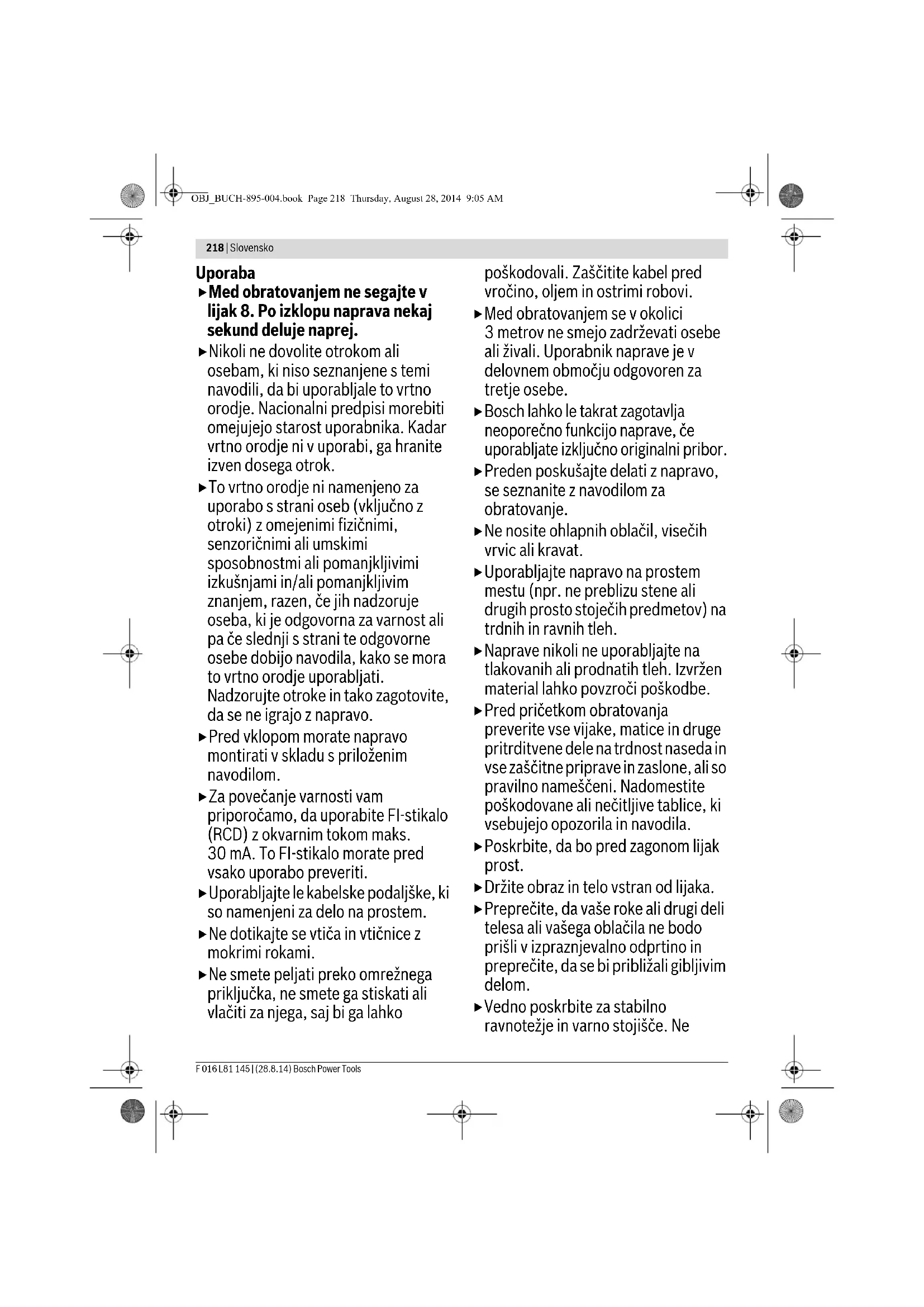 Glede na kakovost drobilnega materiala. Vklopi električnega orodja imajo za posledico kratkotrajne padce napetosti. Pri neugodnih pogojih v omrežju se lahko pojavijo motnje v delovanju drugih naprav. Pri omrežnih impendancah, ki znašajo manj kot 0,36 Ohm, motenj ni pričakovati. Henk Becker Executive Vice President Engineering Helmut Heinzelmann Head of Product Certification PT/ETM9 OBJ_BUCH-895-004.book Page 221 Thursday, August 28, 2014 9:05 AM222 | Slovensko F 016 L81 145 | (28.8.14) Bosch Power Tools Podaljševalni kabel s premajhnim prerezom vodnika povzroči občutno zmanjšanje zmogljivosti naprave. Pri kablih do dolžine 25 m je potrebni prerez vodnika najmanj 3x1,5mm