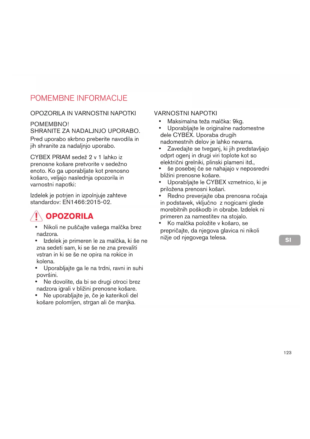 POMEMBNO! SHRANITE ZA NADALJNJO UPORABO. Pred uporabo skrbno preberite navodila in jih shranite za nadaljnjo uporabo. CYBEX PRIAM sedež 2 v 1 lahko iz prenosne košare pretvorite v sedežno enoto. Ko ga uporabljate kot prenosno košaro, veljajo naslednja opozorila in varnostni napotki: VARNOSTNI NAPOTKI y Maksimalna teža malčka: 9kg. y Uporabljajte le originalne nadomestne dele CYBEX. Uporaba drugih nadomestnih delov je lahko nevarna. y Zavedajte se tveganj, ki jih predstavljajo odprt ogenj in drugi viri toplote kot so električni grelniki, plinski plameni itd., y še posebej če se nahajajo v neposredni bližini prenosne košare. y Uporabljajte le CYBEX vzmetnico, ki je priložena prenosni košari. y Redno preverjajte oba prenosna ročaja in podstavek, vključno z nogicami glede morebitnih poškodb in obrabe. Izdelek ni primeren za namestitev na stojalo. y Ko malčka položite v košaro, se prepričajte, da njegova glavica ni nikoli nižje od njegovega telesa. y Nikoli ne puščajte vašega malčka brez nadzora. y Izdelek je primeren le za malčka, ki še ne zna sedeti sam, ki se še ne zna prevaliti vstran in ki se še ne opira na rokice in kolena. y Uporabljajte ga le na trdni, ravni in suhi površini. y Ne dovolite, da bi se drugi otroci brez nadzora igrali v bližini prenosne košare. y Ne uporabljajte je, če je katerikoli del košare polomljen, strgan ali če manjka. OPOZORILA124