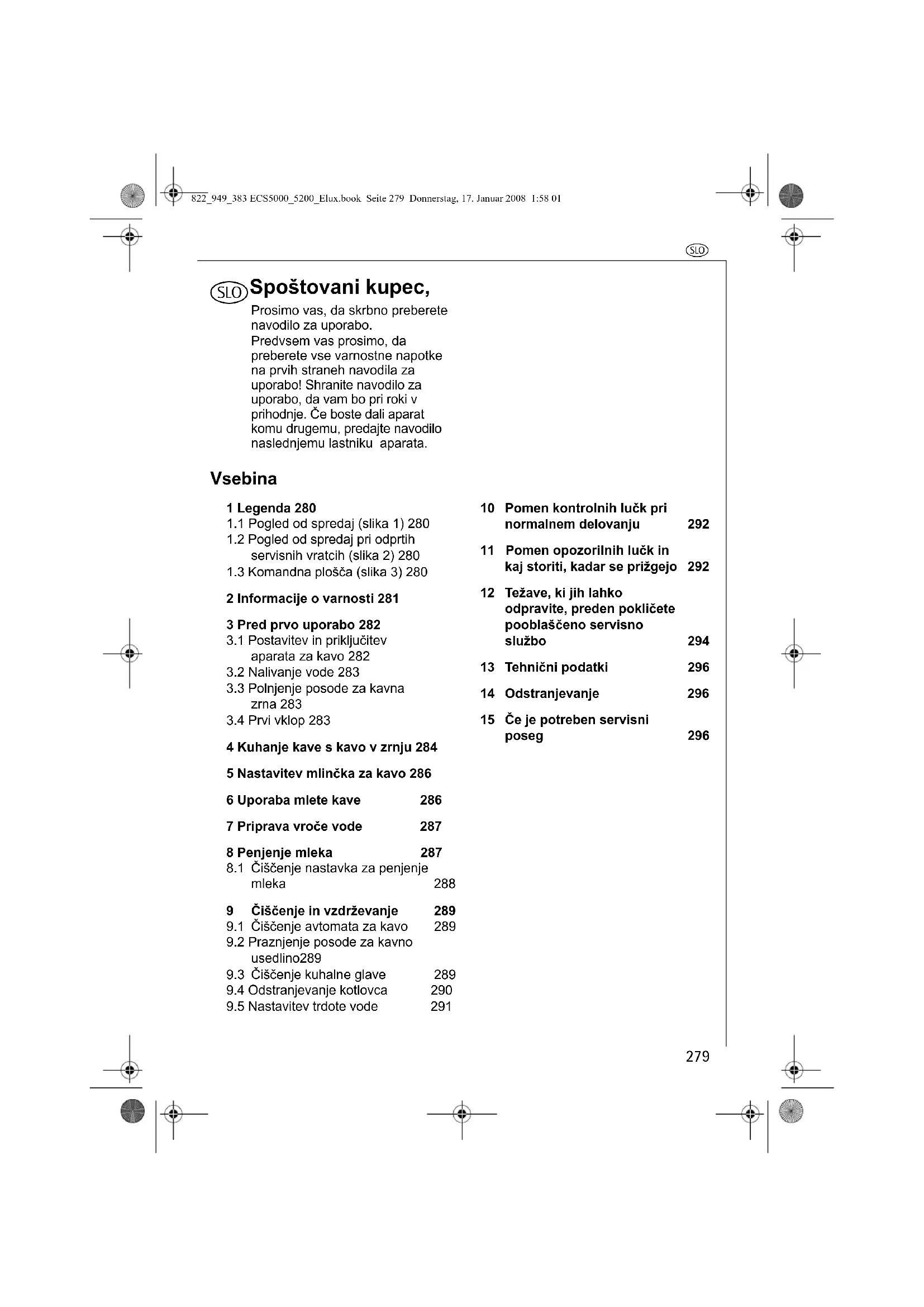 9.4 Odstranjevanje kotlovca 2909.5 Nastavitev trdote vode 29110 Pomen kontrolnih lučk pri normalnem delovanju 29211 Pomen opozorilnih lučk in kaj storiti, kadar se prižgejo 29212 Težave, ki jih lahko odpravite, preden pokličete pooblaščeno servisno službo 294 13 Tehnični podatki 296 14 Odstranjevanje 29615 Če je potreben servisni poseg 296822_949_383 ECS5000_5200_Elux.book Seite 279 Donnerstag, 17. Januar 2008 1:58 01x