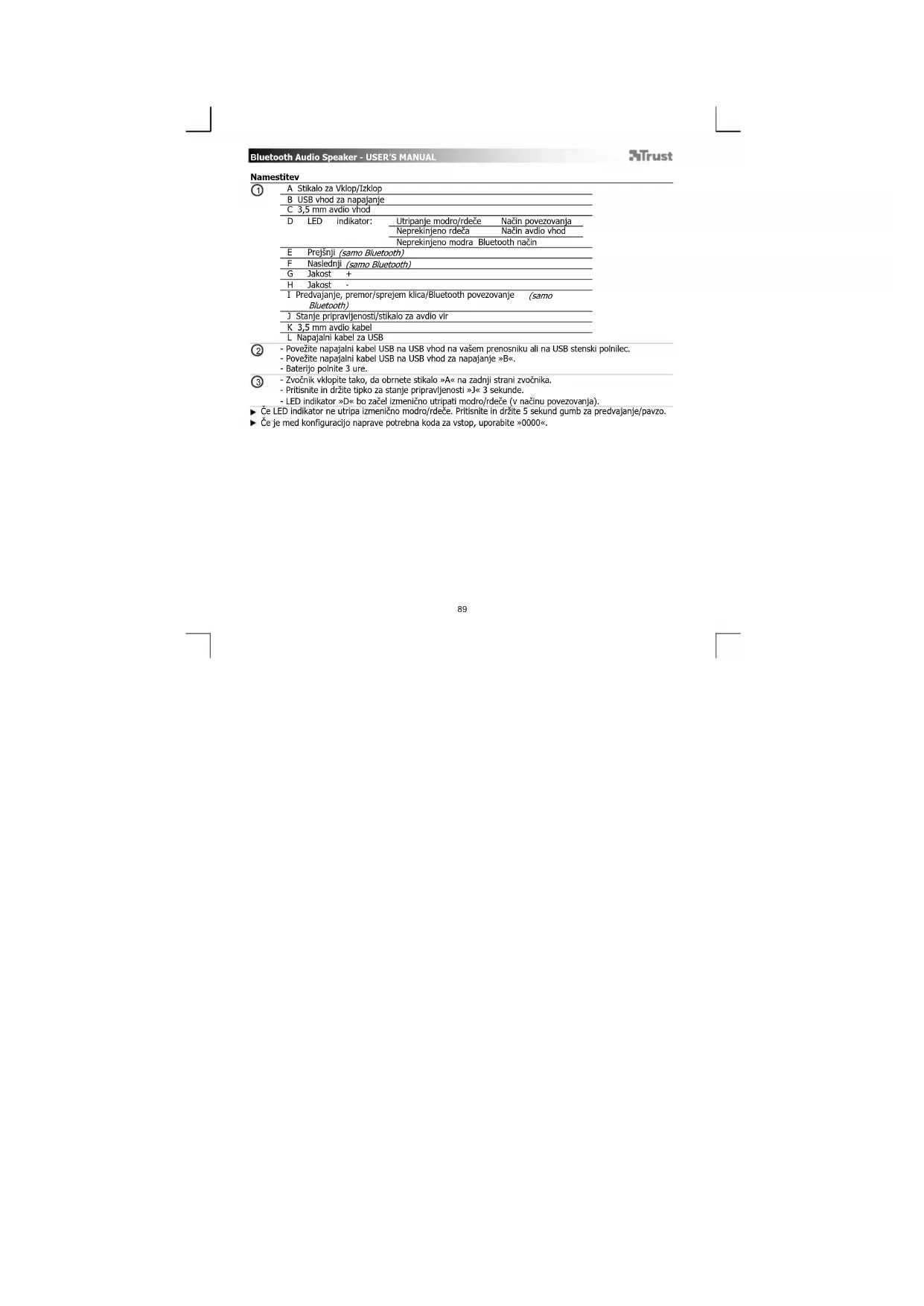- Povežite napajalni kabel USB na USB vhod na vašem prenosniku ali na USB stenski polnilec. - Povežite napajalni kabel USB na USB vhod za napajanje »B«. - Baterijo polnite 3 ure. - Zvočnik vklopite tako, da obrnete stikalo »A« na zadnji strani zvočnika. - Pritisnite in držite tipko za stanje pripravljenosti »J« 3 sekunde. - LED indikator »D« bo začel izmenično utripati modro/rdeče (v načinu povezovanja). Če LED indikator ne utripa izmenično modro/rdeče. Pritisnite in držite 5 sekund gumb za predvajanje/pavzo. Če je med konfiguracijo naprave potrebna koda za vstop, uporabite »0000«.