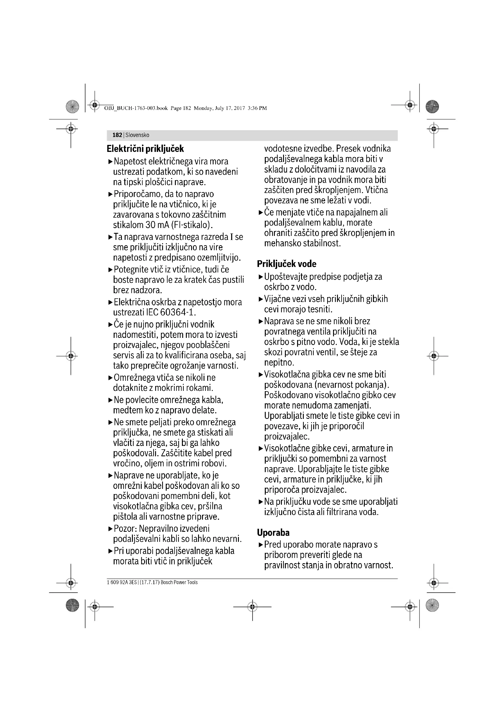 OBJ_BUCH-1763-003.book Page 185 Monday, July 17, 2017 3:36 PM186 | Slovensko 1 609 92A 3ES | (17.7.17) Bosch Power Tools Uporabljajte izključno podaljševalne kable, vodnike ali kabelske bobne, ki so skladni s standardi EN 61242 / IEC 61242 ali IEC 60884-2-7. Če želite pri obratovanju naprave uporabljati podaljševalni kabel, upoštevajte naslednje preseke vodnika: – Prerez vodnika 1,5 mm