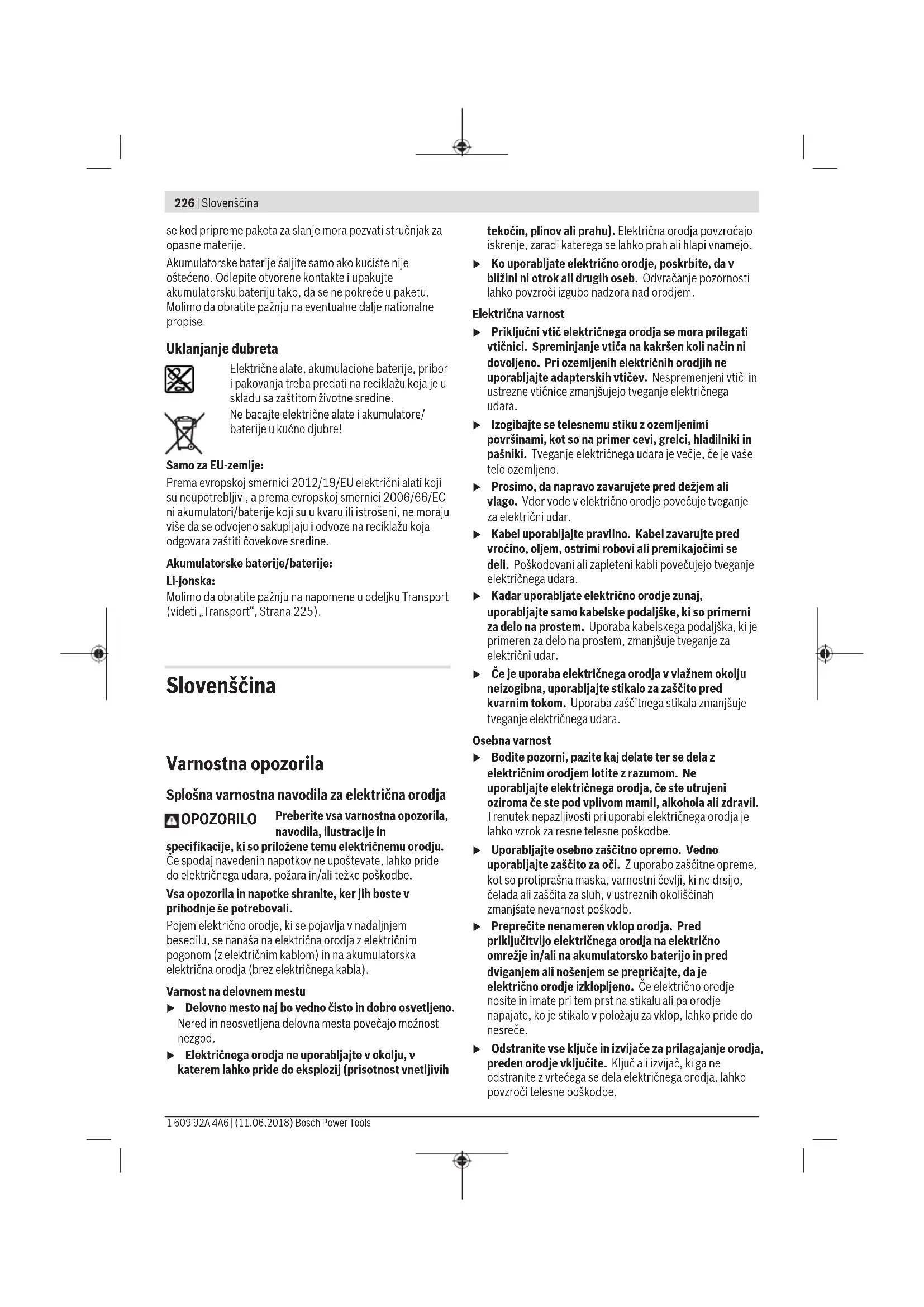 dužine zavrtnja. Održavanje i servis Održavanje i čišćenje Izvadite akku pre svih radova na električnom priboru iz njegovog pribora (na primer održavanja, promene pribora itd.) kao i kod njegovog transporta i čuvanja. Kod slučajnog aktiviranja prekidača za uključivanje- isključivanje postoji opasnost od povrede. Držite električni alat i proreze za ventilaciju čiste, da bi dobro i sigurno radili. Ako akumulator više ne funkcioniše, obratite se jednom ovlašćenom servisu za Bosch-električne alate. Servisna služba i savetovanje o upotrebi Servisna služba odgovoriće na vaša pitanja o popravcima i održavanju vašeg proizvoda i o rezervnim delovima. Uvećane crteže i informacije o rezervnim delovima možete naći na našoj adresi: www.bosch-pt.com Bosch tim za savetovanje o upotrebi će vam rado pomoći ako imate pitanja o našim proizvodima i priboru. Molimo da kod svih pitanja i naručivanja rezervnih delova neizostavno navedete broj predmeta sa 10 brojčanih mesta prema tipskoj tablici proizvoda. Srpski Bosch-Service Dimitrija Tucovića 59 11000 Beograd Tel.: (011) 6448546 Fax: (011) 2416293 E-Mail: asboschz@EUnet.yu Keller d.o.o. Ljubomira Nikolica 29 18000 Nis Tel./Fax: (018) 274030 Tel./Fax: (018) 531798 Web: www.keller-nis.com E-Mail: office@keller-nis.com Transport Akumulatori koji sadrže litijum jon podležu zahtevima prava o opasnim materijama. Akumulatore može korisnik transportovati na putu bez drugih pakovanja. Kod slanja preko trećih lica (na primer vazdušnih transportom ili špedicijom) mora se obratiti pažnja na posebne zahteve u pogledu pakovanja i označavanja. Ovde se mora pozvati kod pripreme komada za slanje ekspert za opasne materije. Šaljite akumuatore samo ako kućište nije oštećeno. Odlepite otvorene kontakte i upakujte akumulator tako, da se ne pokreće u paketu. Molimo da obratite pažnju na eventualne dalje nationalne propise. Uklanjanje djubreta Električne alate, akumulatore, pribor i pakovanja treba odvoziti reciklaži koja odgovara zaštiti čovekove sredine. LED Kapacitet Trajno svetlo 3 x zeleno ≥ 2/3 Trajno svetlo 2 x zeleno ≥1/3 Trajno svetlo 1 x zeleno < 1/3 Trepćuće svetlo 1 x zeleno Reserva OBJ_BUCH-2907-001.book Page 131 Wednesday, July 27, 2016 9:32 AM132 | Slovensko 1 609 92A 2P0 | (27.7.16) Bosch Power Tools Ne bacajte električne alate i akumulatore/baterije u kućno djubre! Samo za EU-zemlje: Prema evropskoj smernici 2012/19/EU ne moraju više neupotrebljivi električni uredjaji a prema evropskoj smernici 2006/66/EC ne moraju ni akumulatori/ba- trerije koji su u kvaru ili istrošeni da se odvojeno sakupljaju i odvoze reciklaži koja odgovara zaštiti čovekove sredine. Akku/baterije: Li-jonska: Molimo da obratite pažnju na uputstva u odeljku „Transport“, stranici 131. Zadržavamo pravo na promene. Slovensko Varnostna navodila Splošna varnostna navodila za električna orodja Preberite vsa opozorila in napotila. Napake zaradi neupoštevanja spodaj navedenih opozoril in napotil lahko povzročijo električni udar, požar in/ali težke telesne poškodbe. Vsa opozorila in napotila shranite, ker jih boste v priho- dnje še potrebovali. Pojem „električno orodje“, ki se pojavlja v nadaljnjem bese- dilu, se nanaša na električna orodja z električnim pogonom (z električnim kablom) in na akumulatorska električna orodja (brez električnega kabla). Varnost na delovnem mestu Delovno področje naj bo vedno čisto in dobro osvetlje- no. Nered in neosvetljena delovna področja lahko povzro- čijo nezgode. Ne uporabljajte električnega orodja v okolju, kjer lahko pride do eksplozij oziroma tam, kjer se nahajajo vnetlji- ve tekočine, plini ali prah. Električna orodja povzročajo iskrenje, zaradi katerega se lahko prah ali para vnameta. Prosimo, da med uporabo električnega orodja ne dovo- lite otrokom ali drugim osebam, da bi se Vam približali. Odvračanje Vaše pozornosti drugam lahko povzroči izgubo kontrole nad napravo. Električna varnost Priključni vtikač električnega orodja se mora prilegati vtičnici. Spreminjanje vtikača na kakršenkoli način ni dovoljeno. Pri ozemljenih električnih orodjih ne upo- rabljajte vtikačev z adapterji. Nespremenjeni vtikači in ustrezne vtičnice zmanjšujejo tveganje električnega udara. Izogibajte se telesnemu stiku z ozemljenimi površinami kot so na primer cevi, grelci, štedilniki in hladilniki. Tve- ganje električnega udara je večje, če je Vaše telo ozemlje- no. Prosimo, da napravo zavarujete pred dežjem ali vlago. Vdor vode v električno orodje povečuje tveganje električ- nega udara. Ne uporabljajte kabla za nošenje ali obešanje električ- nega orodja in ne vlecite za kabel, če želite vtikač izvle- či iz vtičnice. Kabel zavarujte pred vročino, oljem, ostrimi robovi ali premikajočimi se deli naprave. Poško- dovani ali zapleteni kabli povečujejo tveganje električnega udara. Kadar uporabljate električno orodje zunaj, uporabljajte samo kabelske podaljške, ki so primerni za delo na pro- stem. Uporaba kabelskega podaljška, ki je primeren za de- lo na prostem, zmanjšuje tveganje električnega udara. Če je uporaba električnega orodja v vlažnem okolju ne- izogibna, uporabljajte stikalo za zaščito pred kvarnim tokom. Uporaba zaščitnega stikala zmanjšuje tveganje ele- ktričnega udara. Osebna varnost Bodite pozorni, pazite kaj delate ter se dela z električ- nim orodjem lotite z razumom. Ne uporabljajte elek- tričnega orodja, če ste utrujeni oziroma če ste pod vpli- vom mamil, alkohola ali zdravil. Trenutek nepazljivosti med uporabo električnega orodja je lahko vzrok za resne telesne poškodbe. Uporabljajte osebno zaščitno opremo in vedno nosite zaščitna očala. Nošenje osebne zaščitne opreme, na pri- mer maske proti prahu, nedrsečih zaščitnih čevljev, varno- stne čelade ali zaščitnih glušnikov, kar je odvisno od vrste in načina uporabe električnega orodja, zmanjšuje tveganje telesnih poškodb. Izogibajte se nenamernemu