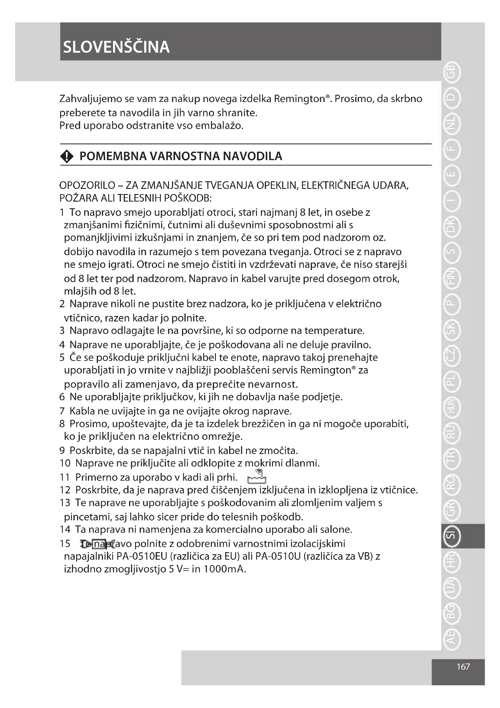 OPOZORILO – ZA ZMANJŠANJE TVEGANJA OPEKLIN, ELEKTRIČNEGA UDARA, POŽARA ALI TELESNIH POŠKODB: 1 To napravo smejo uporabljati otroci, stari najmanj 8 let, in osebe z zmanjšanimi fizičnimi, čutnimi ali duševnimi sposobnostmi ali s pomanjkljivimi izkušnjami in znanjem, če so pri tem pod nadzorom oz. dobijo navodila in razumejo s tem povezana tveganja. Otroci se z napravo ne smejo igrati. Otroci ne smejo čistiti in vzdrževati naprave, če niso starejši od 8 let ter pod nadzorom. Napravo in kabel varujte pred dosegom otrok, mlajših od 8 let. 2 Naprave nikoli ne pustite brez nadzora, ko je priključena v električno vtičnico, razen kadar jo polnite. 3 Napravo odlagajte le na površine, ki so odporne na temperature. 4 Naprave ne uporabljajte, če je poškodovana ali ne deluje pravilno. 5 Če se poškoduje priključni kabel te enote, napravo takoj prenehajte uporabljati in jo vrnite v najbližji pooblaščeni servis Remington® za popravilo ali zamenjavo, da preprečite nevarnost. 6 Ne uporabljajte priključkov, ki jih ne dobavlja naše podjetje. 7 Kabla ne uvijajte in ga ne ovijajte okrog naprave. 8 Prosimo, upoštevajte, da je ta izdelek brezžičen in ga ni mogoče uporabiti, ko je priključen na električno omrežje. 9 Poskrbite, da se napajalni vtič in kabel ne zmočita. 10 Naprave ne priključite ali odklopite z mokrimi dlanmi. 11 Primerno za uporabo v kadi ali prhi. 12 Poskrbite, da je naprava pred čiščenjem izključena in izklopljena iz vtičnice. 13 Te naprave ne uporabljajte s poškodovanim ali zlomljenim valjem s pincetami, saj lahko sicer pride do telesnih poškodb. 14 Ta naprava ni namenjena za komercialno uporabo ali salone. 15 To napravo polnite z odobrenimi varnostnimi izolacijskimi napajalniki PA-0510EU (različica za EU) ali PA-0510U (različica za VB) z izhodno zmogljivostjo 5 V= in 1000mA. SLOVENŠČINA GBDNLFEIDKSFINPSKCZ HUN PLRUTRROGRSIBG HRUAAE168