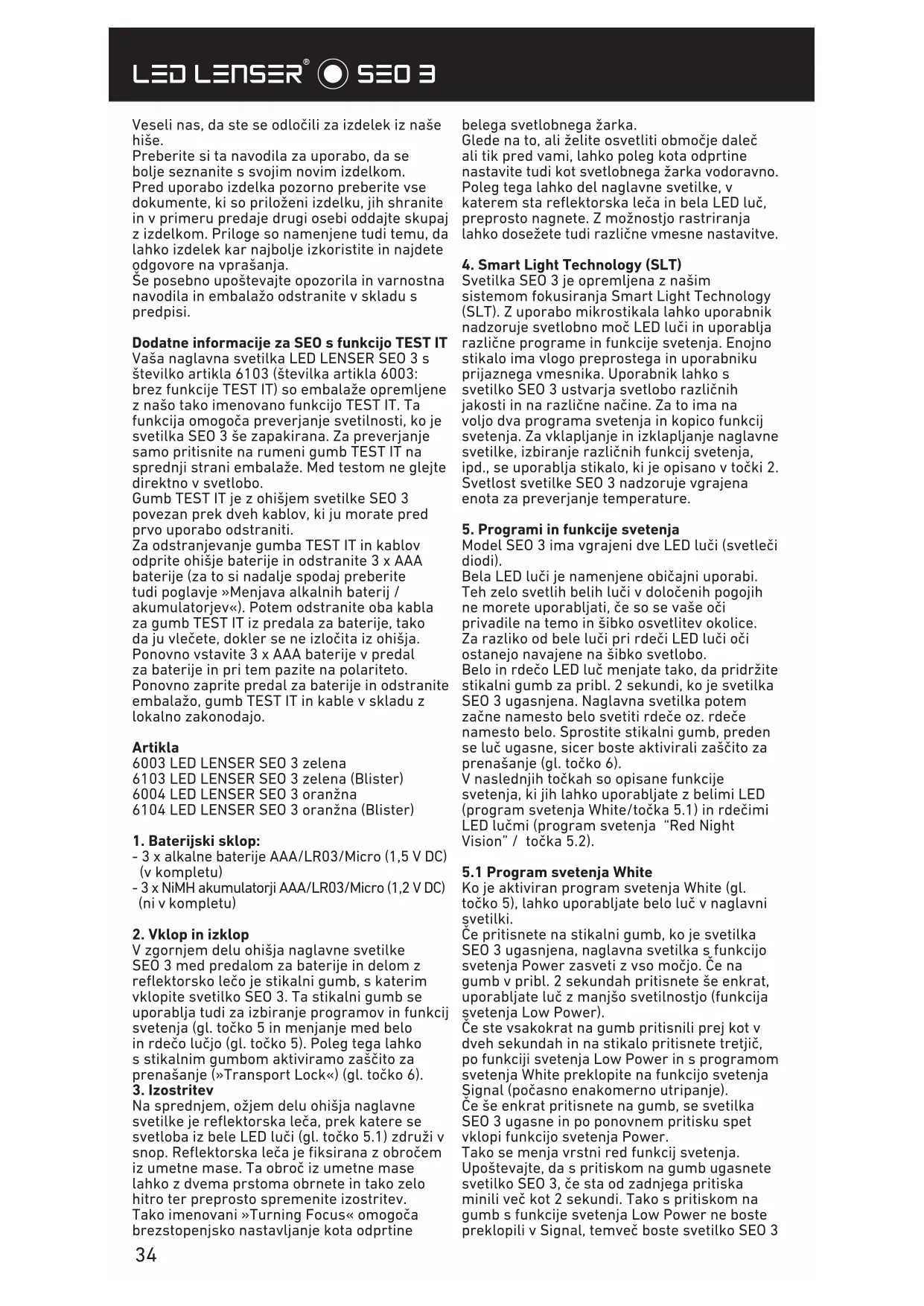 Baterij, ki niso namenjene ponovnemu polnjenju (npr. alkalne baterije), ne smete polniti. Nikoli istorcasno ne uporabljaje akumulatorjev in baterij. Vedno zamenjaje vse baterije hkrati. Za svetilko SEO 3 uporabljaje izkljućno alkalne baterije (AAA/LR03/Micro 1,5 V DC).