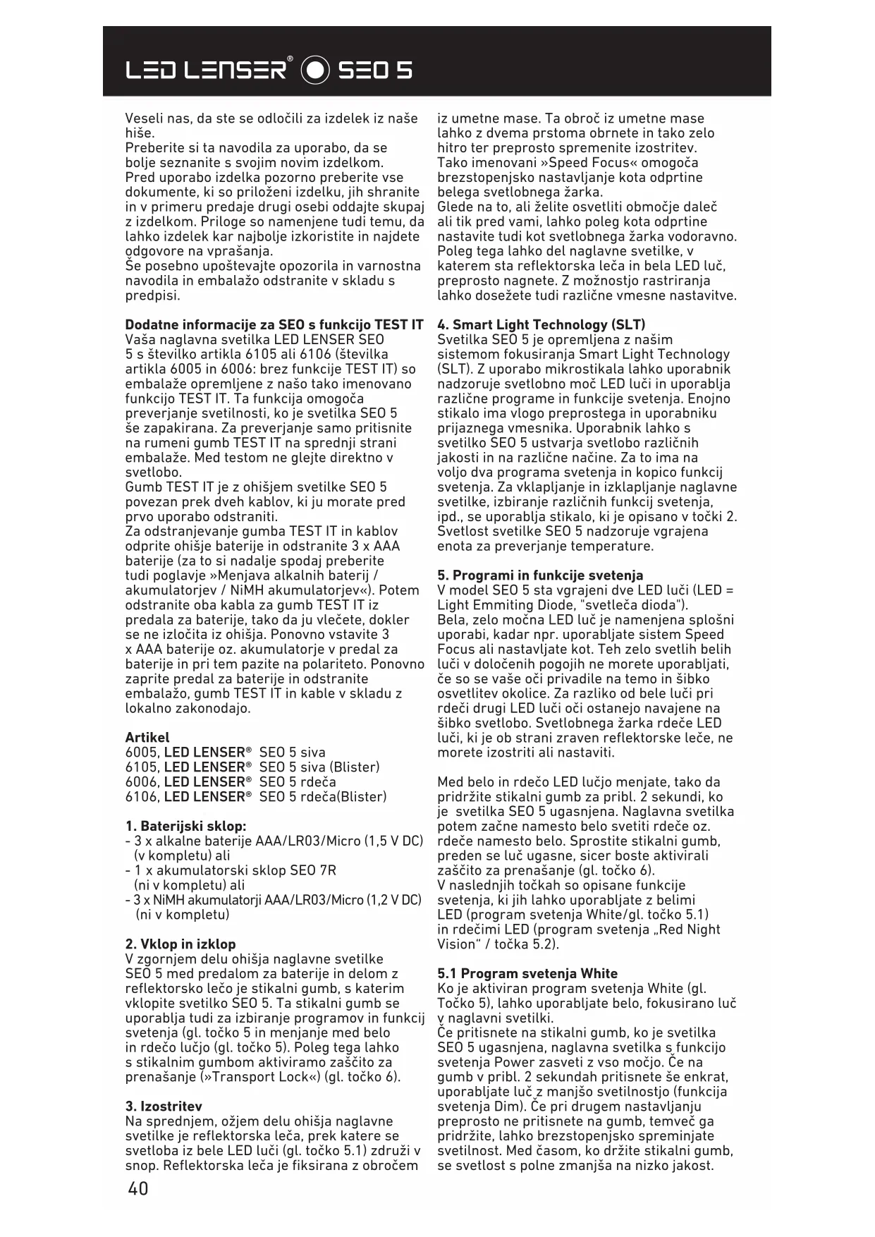 Veseli nas, da ste se odločili za izdelek iz naše hiše. Preberite si ta navodila za uporabo, da se bolje seznanite s svojim novim izdelkom. Pred uporabo izdelka pozorno preberite vse dokumente, ki so priloženi izdelku, jih shranite in v primeru predaje drugi osebi oddajte skupaj z izdelkom. Priloge so namenjene tudi temu, da lahko izdelek kar najbolje izkoristite in najdete odgovore na vprašanja. Še posebno upoštevajte opozorila in varnostna navodila in embalažo odstranite v skladu s predpisi. Dodatne informacije za SEO s funkcijo TEST IT Vaša naglavna svetilka LED LENSER SEO 5 s številko artikla 6105 ali 6106 (številka artikla 6005 in 6006: brez funkcije TEST IT) so embalaže opremljene z našo tako imenovano funkcijo TEST IT. Ta funkcija omogoča preverjanje svetilnosti, ko je svetilka SEO 5 še zapakirana. Za preverjanje samo pritisnite na rumeni gumb TEST IT na sprednji strani embalaže. Med testom ne glejte direktno v svetlobo. Gumb TEST IT je z ohišjem svetilke SEO 5 povezan prek dveh kablov, ki ju morate pred prvo uporabo odstraniti. Za odstranjevanje gumba TEST IT in kablov odprite ohišje baterije in odstranite 3 x AAA baterije (za to si nadalje spodaj preberite tudi poglavje »Menjava alkalnih baterij / akumulatorjev / NiMH akumulatorjev«). Potem odstranite oba kabla za gumb TEST IT iz predala za baterije, tako da ju vlečete, dokler se ne izločita iz ohišja. Ponovno vstavite 3 x AAA baterije oz. akumulatorje v predal za baterije in pri tem pazite na polariteto. Ponovno zaprite predal za baterije in odstranite embalažo, gumb TEST IT in kable v skladu z lokalno zakonodajo. Artikel 6005, LED LENSER® SEO 5 siva 6105, LED LENSER® SEO 5 siva (Blister) 6006, LED LENSER® SEO 5 rdeča 6106, LED LENSER® SEO 5 rdeča(Blister)