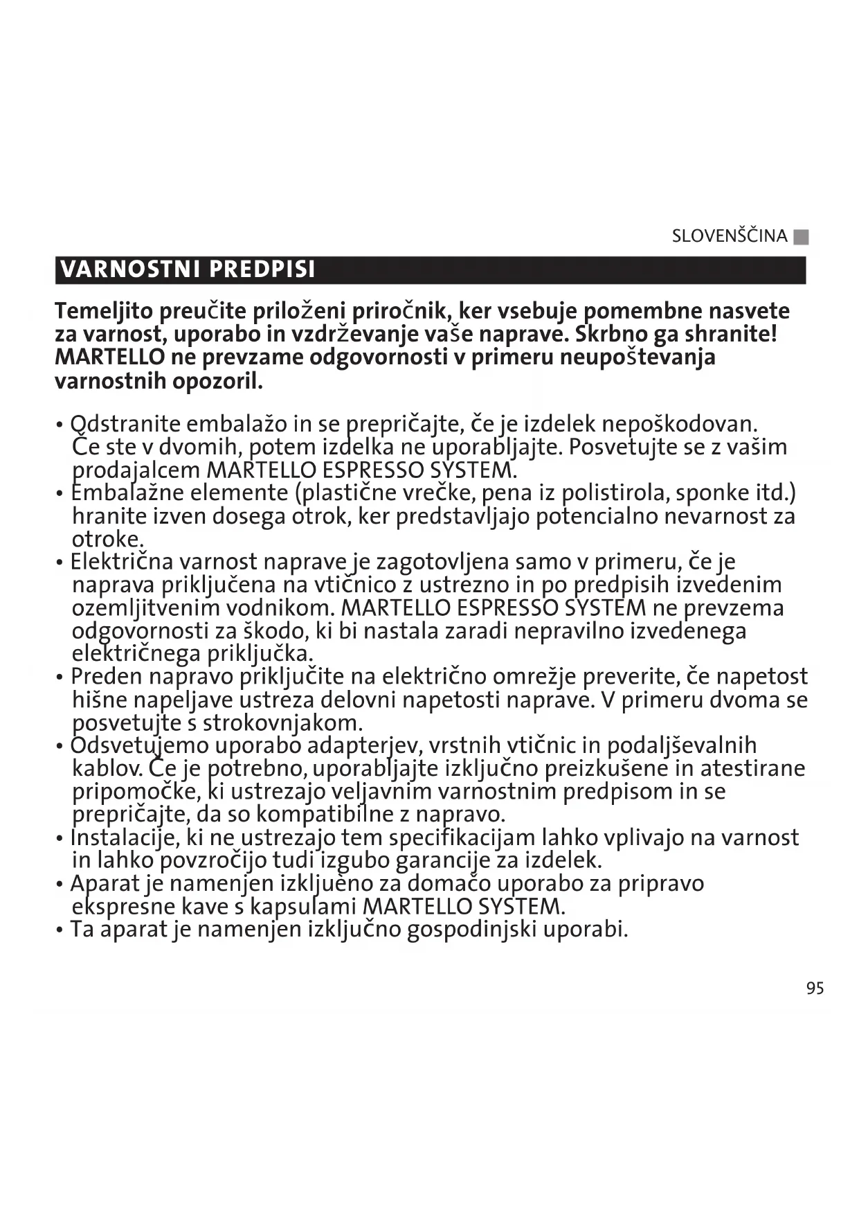 - V primeru okvare in/ali nepravilnega delovanja napravo izključite iz električnega omrežja in je ne odpirajte. Če je potrebno popravilo, poiščite pomoč pri zastopniku MARTELLO ESPRESSO SYSTEM. VARNOSTNI PREDPISI g SLOVENŠČINA