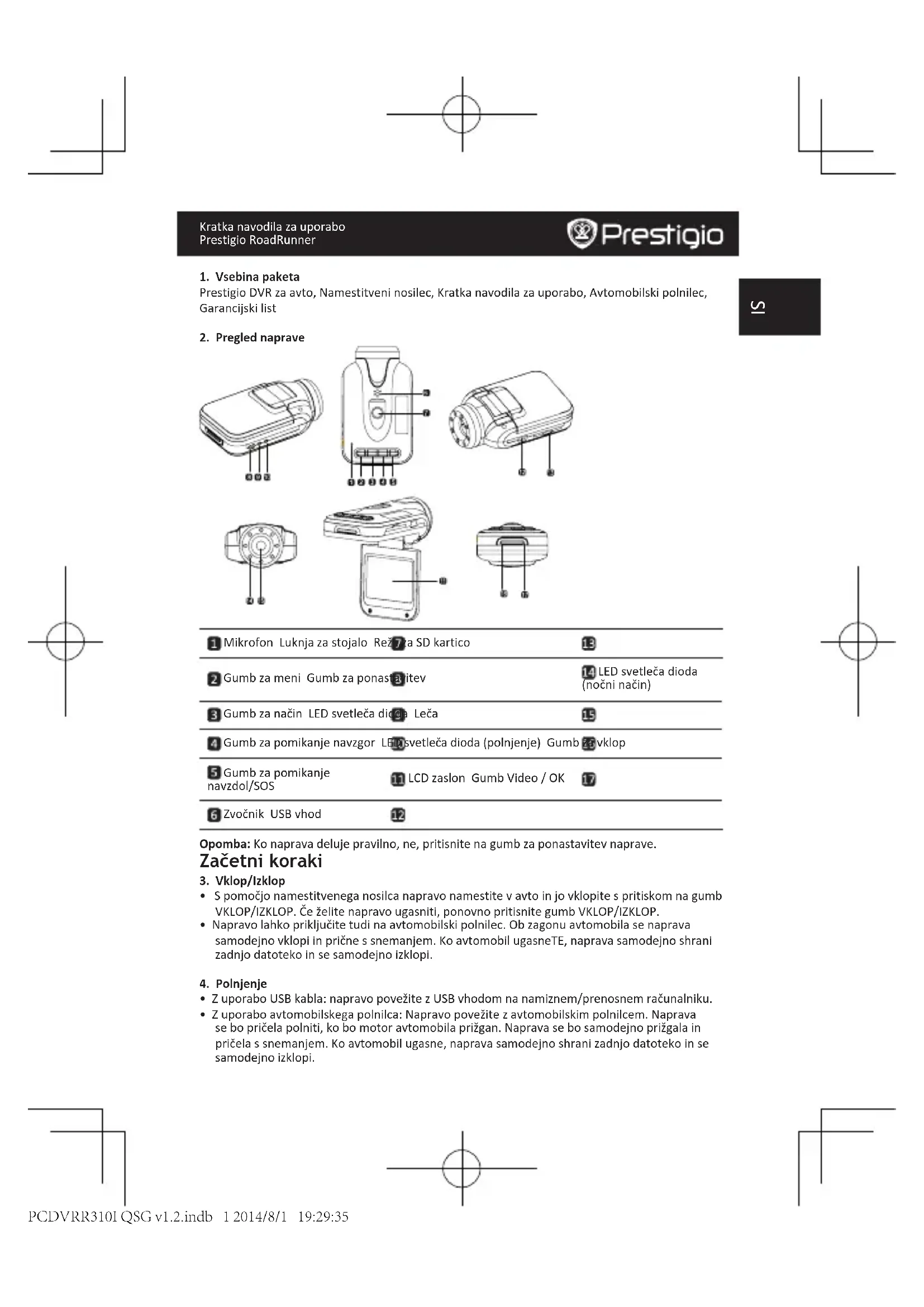 - Naprave nikoli ne postavite v bližino opreme, ki proizvaja močnoelektromagnetno polje. Izpostavljanje močnim magnetnim poljemlahko povzroči motnje v delovanju ter lahko povzroči poškodbo aliizgubo podatkov. Tehnične podrobnosti Snemalna ločljivost 1280 x 720(30fps), 848 x 480, 640 x 360 slikovnih pik Video format MOV Slikovni format JPG Vir energije Baterija Vmesniki USB, SD kartica (podpira največ 32GB, priporočljiva mikro SD kartica visoke hitrosti) Mikrofon Vgrajen v napravo Temperatura delovanja 0 °~ 45°C Izjava o odgovornosti Ker se izdelki Prestigio nenehno posodabljajo in nadgrajujejo, imata lahko programska in strojna oprema vaše naprave nekoliko drugačen videz ali drugačne funkcije od tistih, ki so navedene v teh kratkih navodilih za uporabo. Prestigio izjavlja, da ta Roadrunner ustreza osnovnim zahtevam in drugim ustreznim določbam EU Direktive , 1999/5/EC. Celotna verzija direktive o skladnosti 1999/5/ES je na voljo na strani: www.prestigio.com/certificates. PCDVRR310I QSG v1.2.indb 4 2014/8/1 19:29:36Krátky návod Prestigio RoadRunner