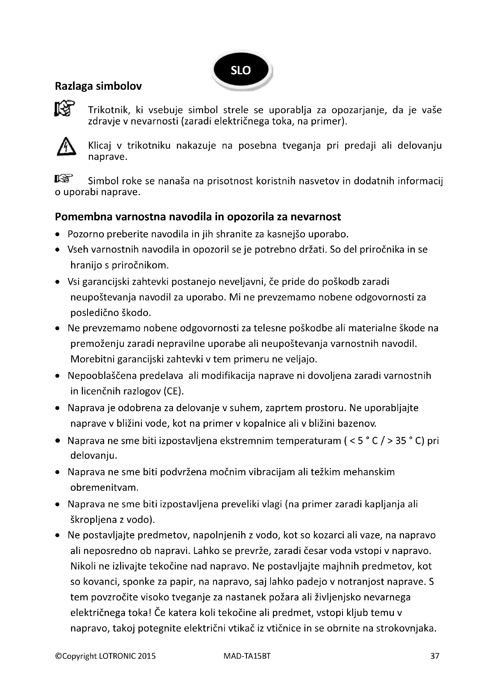 - Ne postavljajte predmetov, napolnjenih z vodo, kot so kozarci ali vaze, na napravo ali neposredno ob napravi. Lahko se prevrže, zaradi česar voda vstopi v napravo. Nikoli ne izlivajte tekočine nad napravo. Ne postavljajte majhnih predmetov, kot so kovanci, sponke za papir, na napravo, saj lahko padejo v notranjost naprave. S tem povzročite visoko tveganje za nastanek požara ali življenjsko nevarnega električnega toka! Če katera koli tekočine ali predmet, vstopi kljub temu v napravo, takoj potegnite električni vtikač iz vtičnice in se obrnite na strokovnjaka. SLO©Copyright LOTRONIC 2015 MAD-TA15BT 38