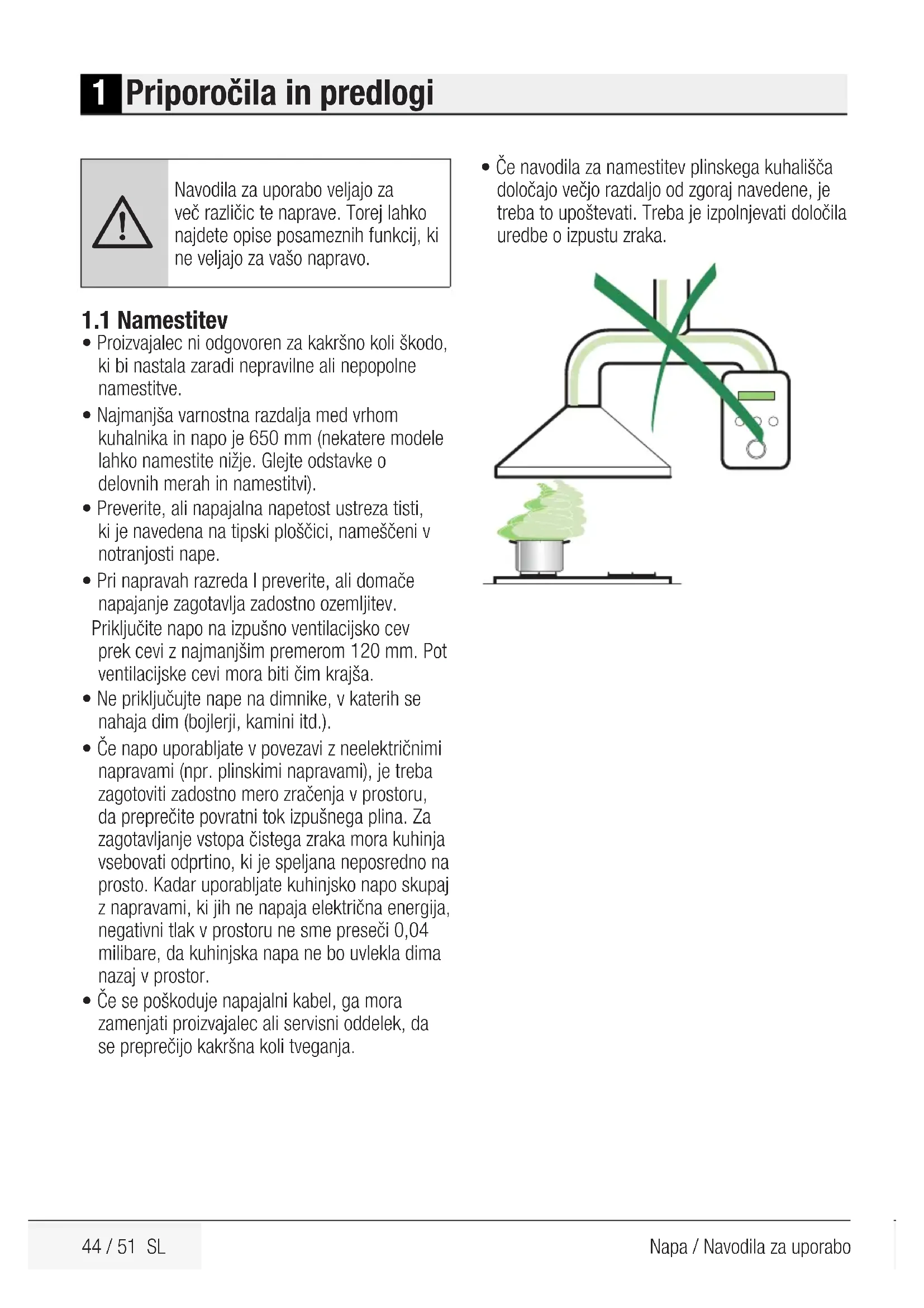 - Če navodila za namestitev plinskega kuhališča določajo večjo razdaljo od zgoraj navedene, je treba to upoštevati. Treba je izpolnjevati določila uredbe o izpustu zraka.45 / 51 SLNapa / Navodila za uporabo