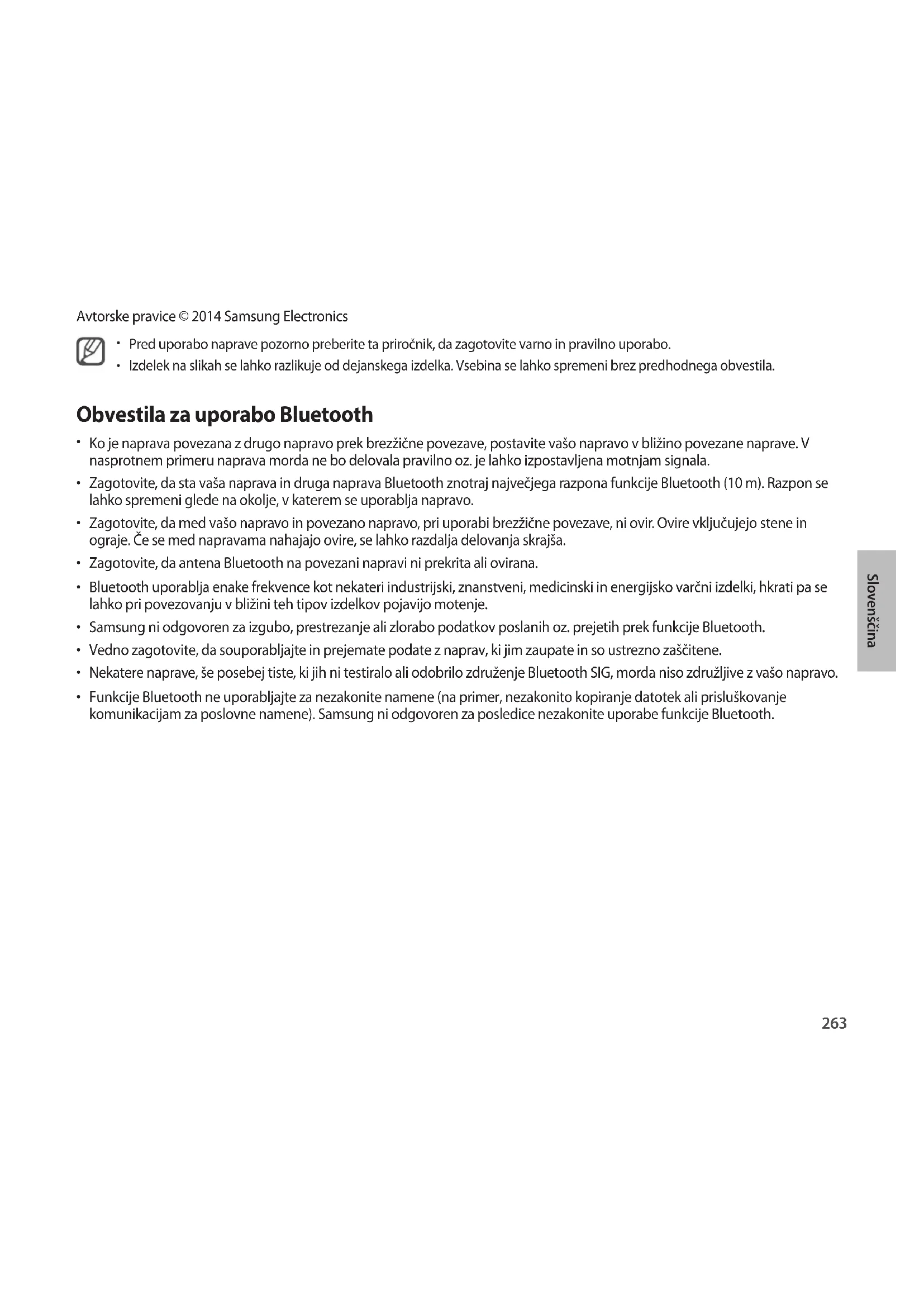 Družba Samsung ne prevzema odgovornosti za kakršne koli poškodbe ali izgubo (bodisi po pogodbi ali nepogodbeno, vključno z malomarnostjo), do katerih lahko pride zaradi nenatančnega upoštevanja teh opozoril in navodil, z izjemo smrti ali osebnih poškodb, do katerih pride zaradi malomarnosti družbe Samsung.