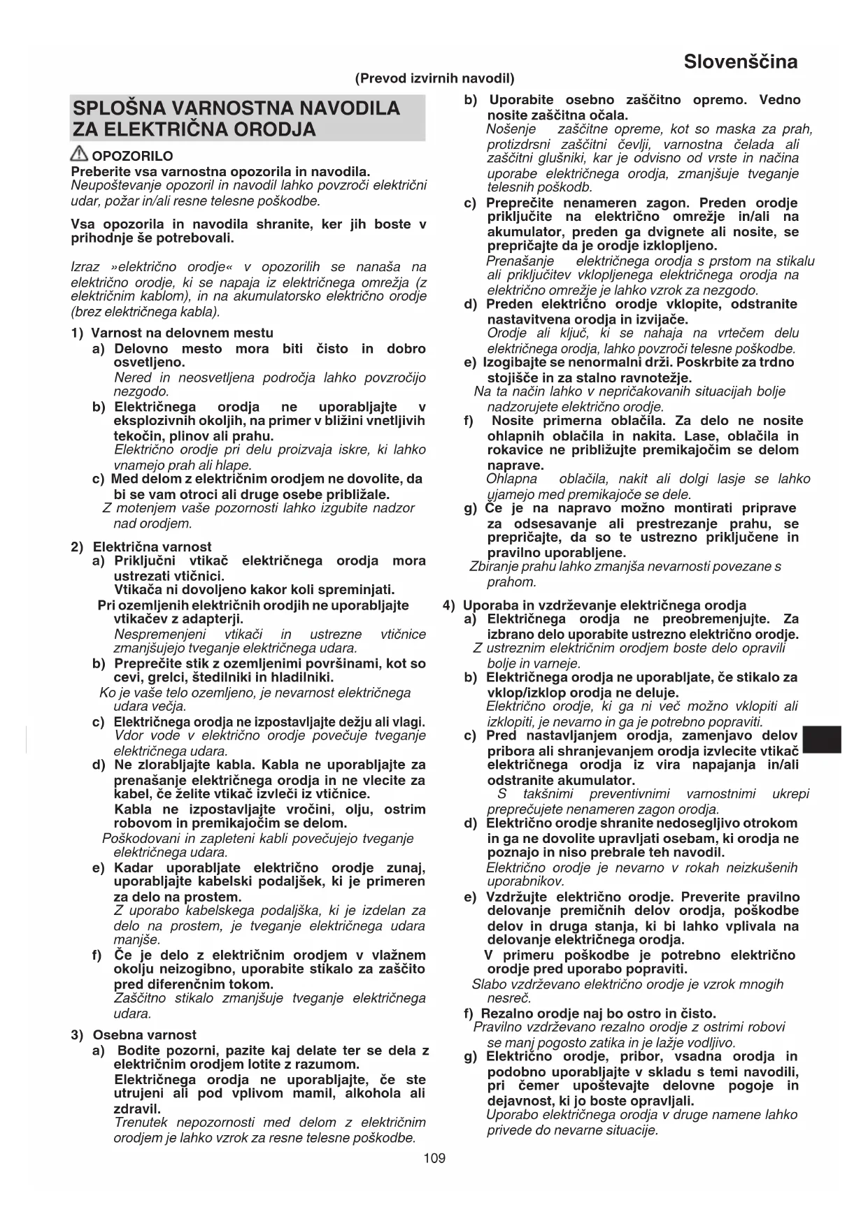 OPOZORILO Preberite vsa varnostna opozorila in navodila. Neupoštevanje opozoril in navodil lahko povzroči električni udar, požar in/ali resne telesne poškodbe. Vsa opozorila in navodila shranite, ker jih boste v prihodnje še potrebovali. Izraz »električno orodje« v opozorilih se nanaša na električno orodje, ki se napaja iz električnega omrežja (z električnim kablom), in na akumulatorsko električno orodje (brez električnega kabla).