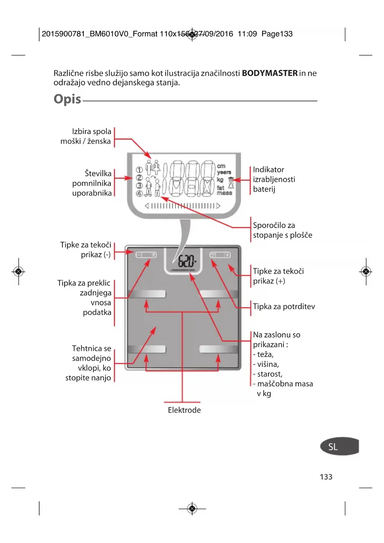 Različne risbe služijo samo kot ilustracija značilnosti BODYMASTER in ne odražajo vedno dejanskega stanja. Opis Izbira spola moški / ženska Številka pomnilnika uporabnika Tipke za tekoči prikaz (-) Tipka za preklic zadnjega vnosa podatka Tehtnica se samodejno vklopi, ko stopite nanjo Indikator izrabljenosti baterij Sporočilo za stopanje s plošče Tipke za tekoči prikaz (+) Tipka za potrditev Na zaslonu so prikazani : - teža, - višina, - starost, - maščobna masa v kg Elektrode 2015900781_BM6010V0_Format 110x156 27/09/2016 11:09 Page133Nov pristop h kontroliranju teže Za boljše obvladovanje telesne teže in videza je pomembno, da poznate svojo zgradbo telesa (voda, mišice, kosti in maščobna masa). Mišice in maščobna masa, ki v glavnem sestavljajo težo, so nujno potrebne za življenje in morajo biti enakomerno razporejene. Porazdelitev se razlikuje glede na spol, starost in velikost. Mišice omogočajo izvajanje telesnih dejavnosti, dviganje predmetov, premikanje brez težav. Večja kot je mišična masa, več energije se porabi in s tem omogoča lažje obvladovanje teže. Maščobna masa služi kot izolacija, zaščita in rezervna energija. Je inertna in shranjuje odvečne kalorije v primeru, da pojeste več, kot porabite. Fizična aktivnost omogoča njeno zmanjšanje, sedeč način življenja pa jo povečuje. Velika količina maščobne mase predstavlja nevarnost za zdravje (kardiovaskularno tveganje, holesterol …). V okviru dietnega režima vam bo BODYMASTER pomagal nadzirati izgubo maščobne mase, hkrati pa bo poskrbel za to, da obdržite mišično maso. Slaba prehrana lahko dejansko povzroči izgubo mišične mase. Mišice so namreč tiste, ki porabijo energijo. Če izgubljamo mišice, porabimo manj kalorij in telo začne skladiščiti maščobo. Zato ni mogoča trajna izguba maščobne mase brez ohranjanja mišične mase. BODYMASTER omogoča upravljanje vašega dietnega režima in trajno obvladovanje telesnega ravnotežja. Da bi naprava dajala kar najboljše rezultate, morate izvajati telesno meritev vedno pod enakimi pogoji: – obvezno z bosimi nogami(neposreden stik s kožo). Noge morajo biti suhe in pravilno nameščene na elektrode (glejte 2. stran). Pozor: če je koža na stopalih preveč poroženela, so meritve lahko napačne. – po možnosti enkrat na teden, takoj ko vstanete (da se ne bi upoštevala nihanja teže čez dan, do katerih prihaja zaradi prehranjevanja, prebave ali fizične dejavnosti). – 1/4 ure po vstajanju, zato da se voda, ki jo vsebuje vaše telo, porazdeli v spodnje okončine. Pomembno je tudi preveriti, da ni nobenega stika med nogama (bedra, kolena, meči) in med podplatoma. Po potrebi med nogi namestite kos papirja. Merilno načelo Ko stopite na ploščo z bosimi nogami, prenesejo elektrode v notranjost