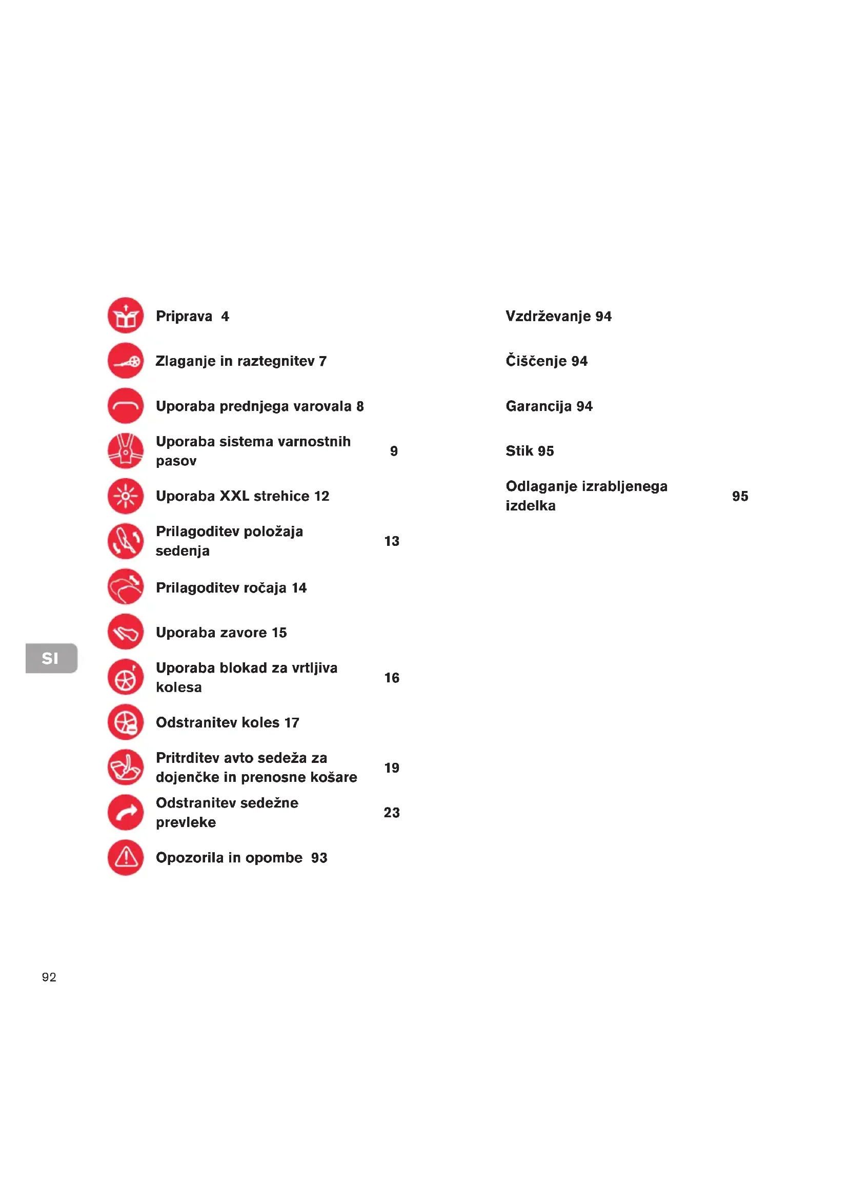 Priprava 4 Zlaganje in raztegnitev 7 Uporaba prednjega varovala 8 Uporaba sistema varnostnih pasov