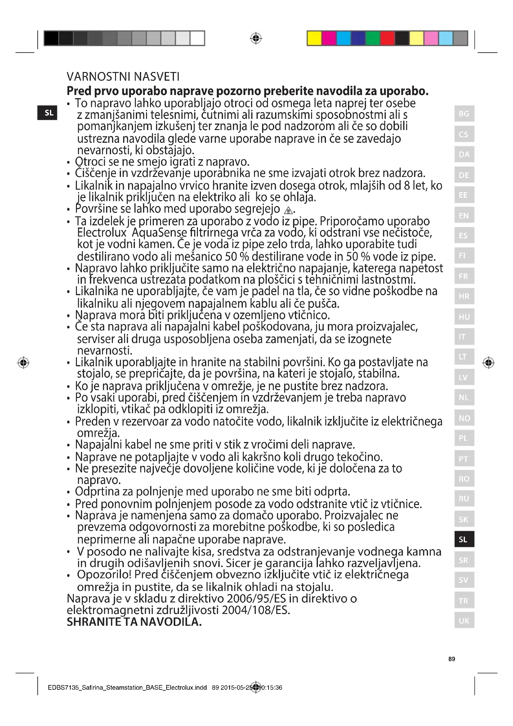 Funkciji izpusta pare in navpičnega izpusta pare ne delujeta. Funkcija izpusta pare je bila v kratkem času pogosto uporabljena. Pred uporabo funkcije izpusta pare likalnik položite v vodoraven položaj in počakajte. Likalnik se ne segreje dovolj. Nastavite primerno temperaturo za izpust pare (do ). Likalnik položite v vodoraven položaj in počakajte, da ugasne kontrolna lučka temperature. Voda izteka iz likalne plošče med likanjem. Likalnik ni dovolj vroč. Nastavite gumb za temperaturo na temperaturo ( najvišjo), ki je primerna za likanje s paro. Likalnik postavite pokonci in počakajte, da lučka ugasne, preden začnete likati. Med likanjem likalna plošča za sabo pušča drobce in umazanijo Uporabili ste trdo vodo, ki je povzročila, da so v posodi za vodo nastali drobci vodnega kamna. Pritisnite in približno eno minuto držite gumb za paro, da se začne izločati para. Nato držite še eno minuto, da očistite sistem za ustvarjanje pare. Zlikajte staro brisačo, da zagotovite, da se morebitni ostanki iz likalnika ne prenesejo na perilo. Če je potrebno, obrišite likalno ploskev z rahlo navlaženo krpo. Voda izteka iz likalne plošče med ohlajanjem likalnika ali po tem, ko ste ga shranili. Likalnik ste postavili v vodoravni položaj, ko je bila voda še v posodi za vodo. Pred shranjevanjem likalnika izpraznite posodo za vodo in nastavite krmilnik za paro v položaj za izklop. Med likanjem likalna plošča pušča rjave črte in maže perilo. Uporabili ste kemična sredstva za odstranjevanje vodnega kamna. Ne uporabljajte sredstev za odstranjevanje vodnega kamna. Vlakna tkanin so se nabrala v odprtinah likalne plošče in se žgejo. Likalno ploščo očistite z vlažno mehko krpo. Perilo morda ni ustrezno izprano ali pa so oblačila nova in pred likanjem niso bila oprana. Perilo ponovno ustrezno izperite. ODSTRANJEVANJE Reciklirajte materiale, ki jih označuje simbol . Embalažo odložite v ustrezne zabojnike za reciklažo. Pomagajte zaščititi okolje in zdravje ljudi ter reciklirati odpadke električnih in elektronskih naprav. Naprav, označenih s simbolom , ne odstranjujte z gospodinjskimi odpadki. Izdelek vrnite na krajevno zbirališče za recikliranje ali se obrnite na občinski urad. www.electrolux.com